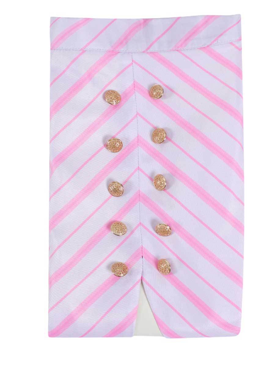 Design: Galinda Witch Costume inspired by american musical fantasy film, features a pink short jacket with long sleeves, a pink long sleeved shirt, an allover geometric striped print, and a matching double layered skirt. Stand out from the crowd and embody your favorite character with this stunning cosplay costume.