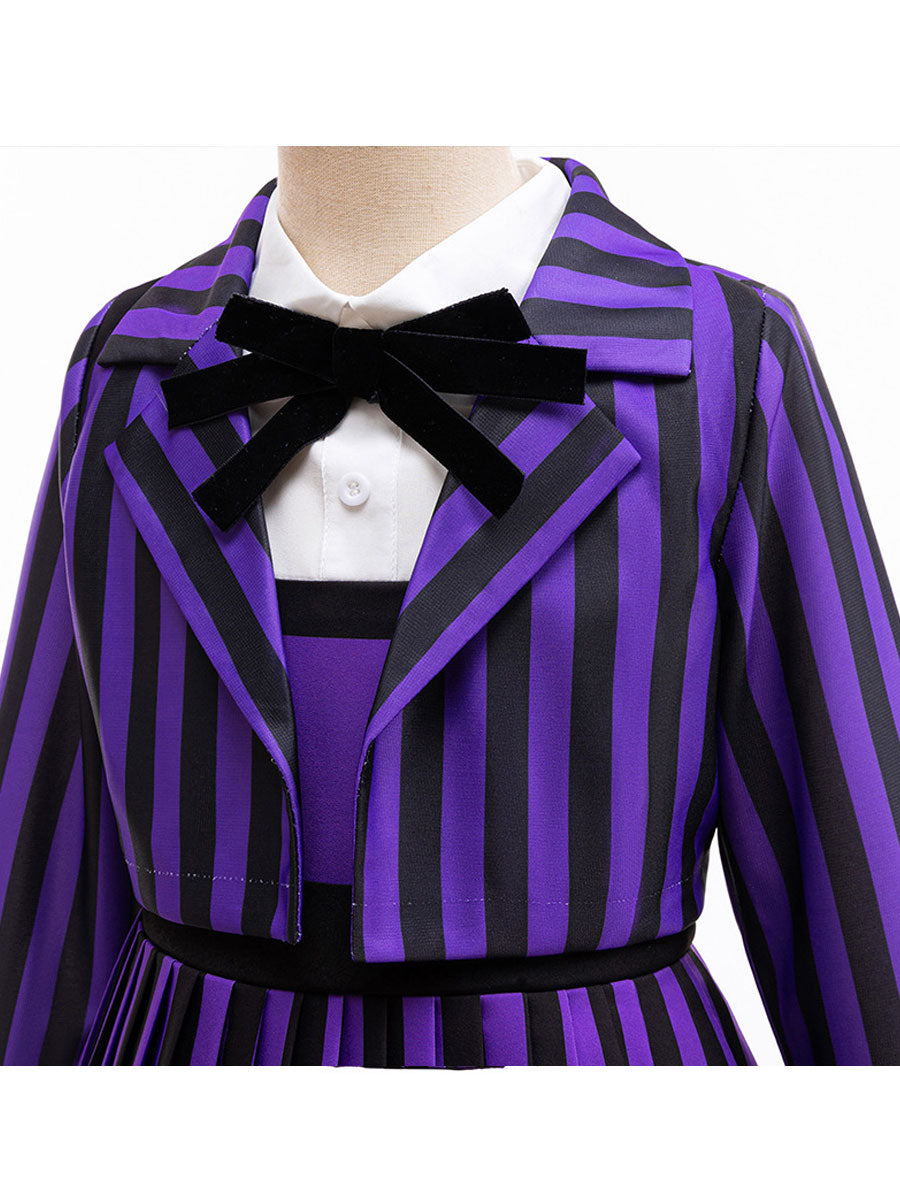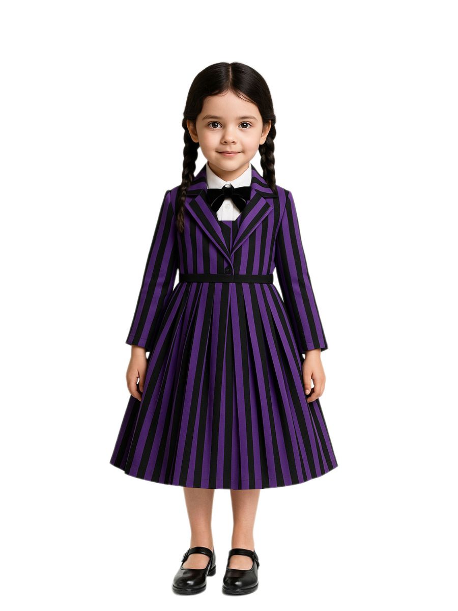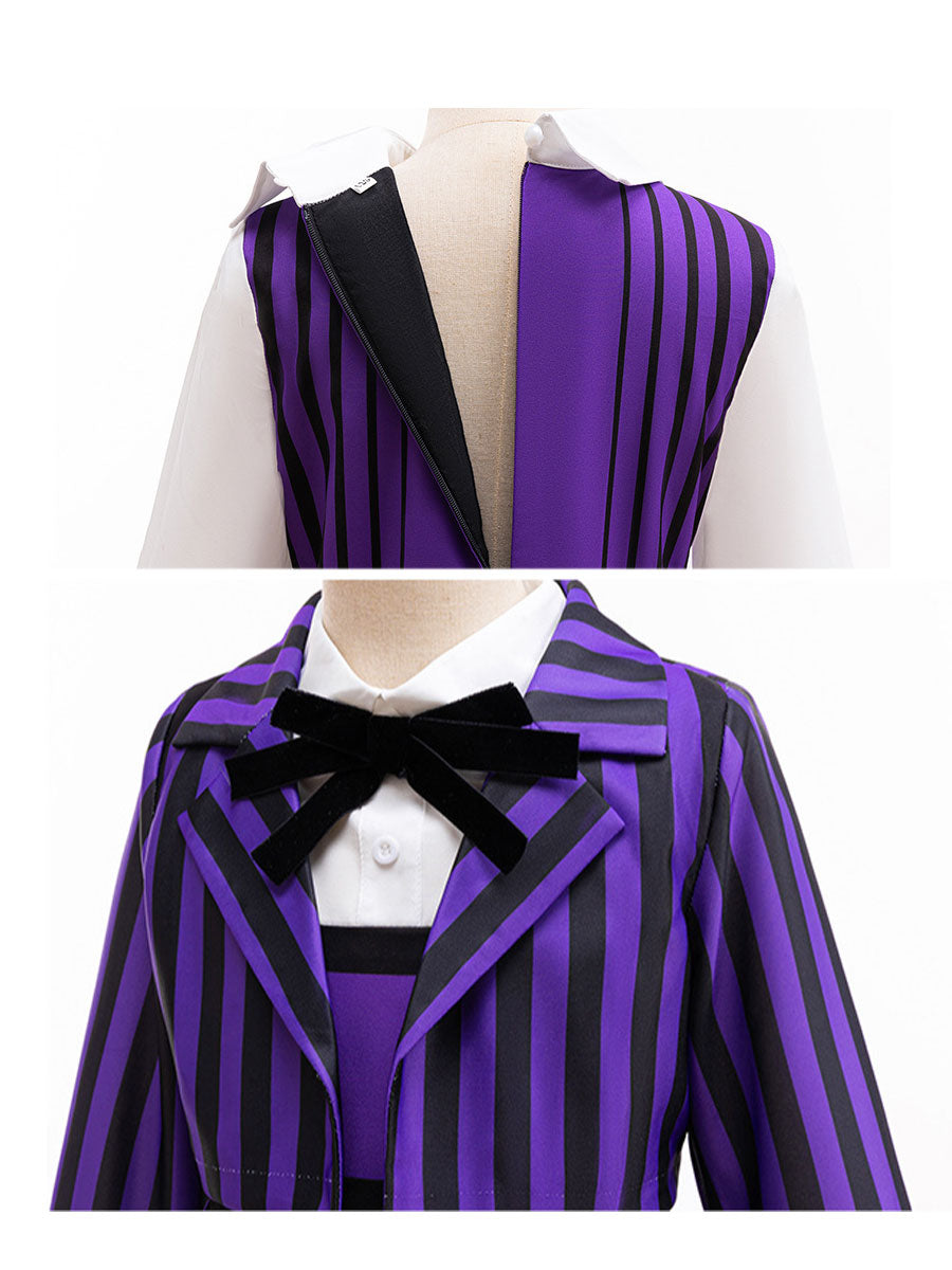 Design: Gothic School Uniform Costume featuring a pleated A-line dress, back zipper up closures, and matching striped cropped jacket for a complete look, classic black and purple vertical stripes, restores the roles character.
