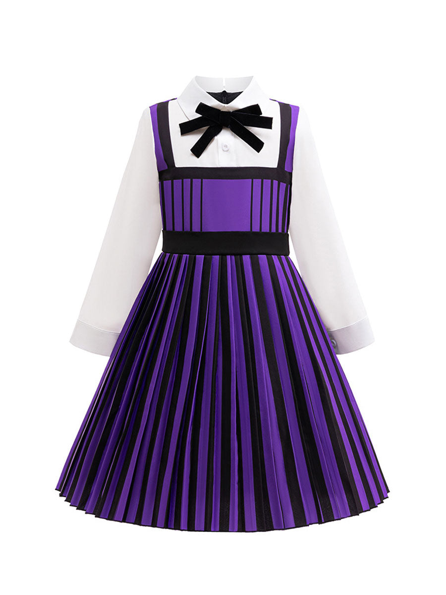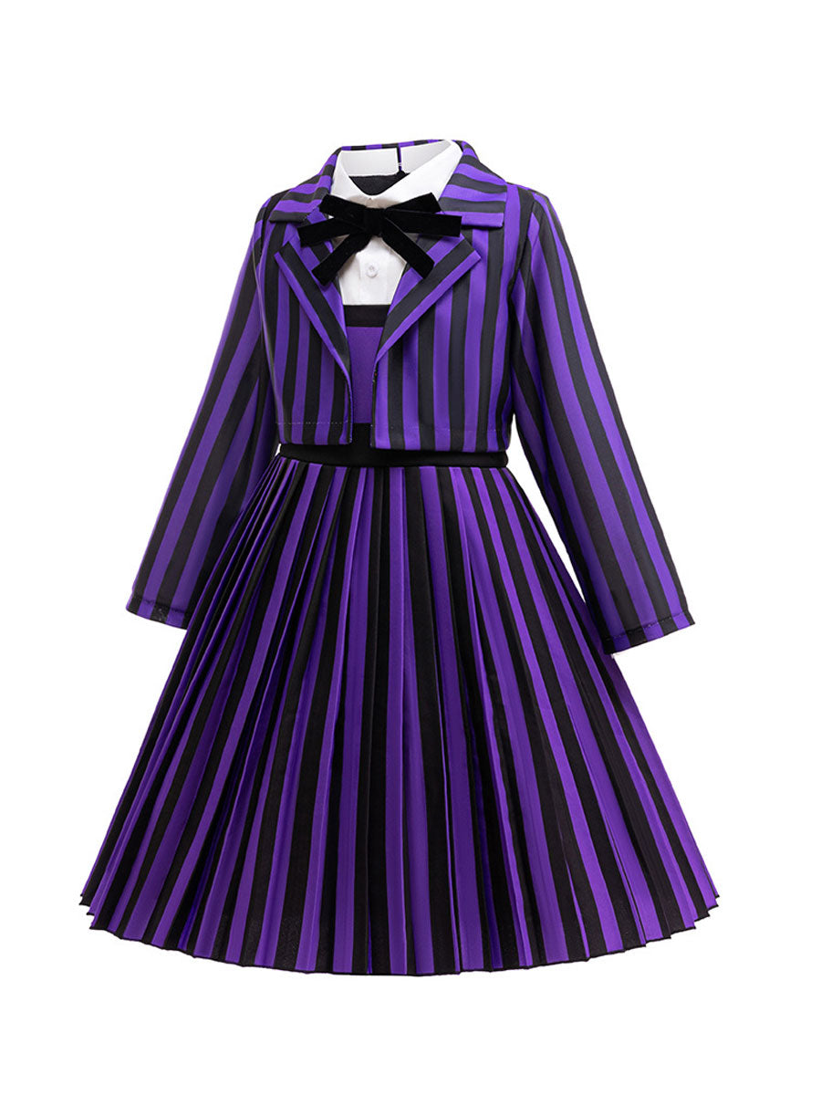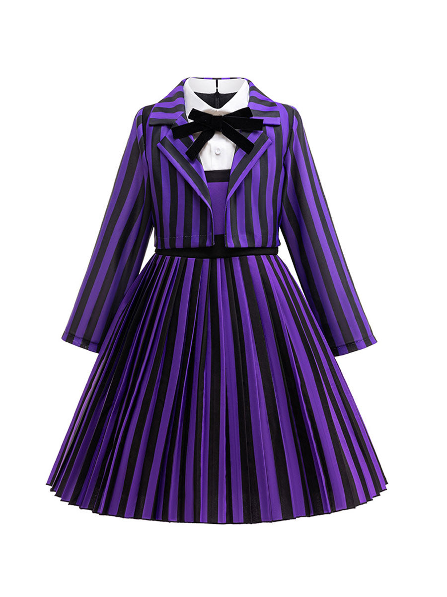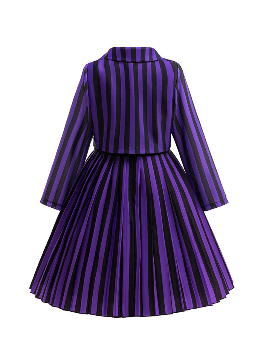 Design: Gothic School Uniform Costume featuring a pleated A-line dress, back zipper up closures, and matching striped cropped jacket for a complete look, classic black and purple vertical stripes, restores the roles character.