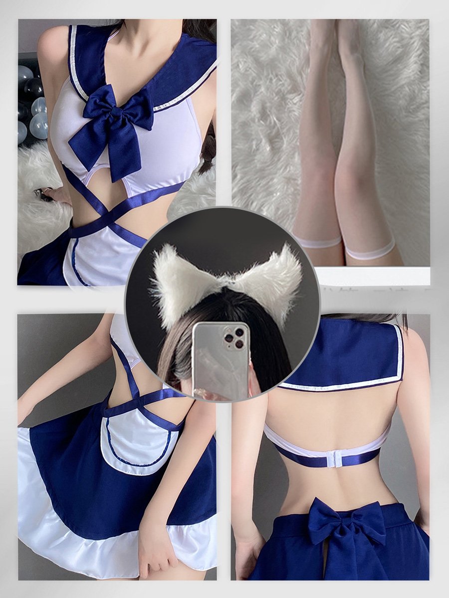 Design: This Anime Cosplay Uniform featuring a white and navy blue mini dress, japanese sailor neck, a cut out bodice, a navy blue bow accents, white ruffled hemline, for a great cosplay costume look.