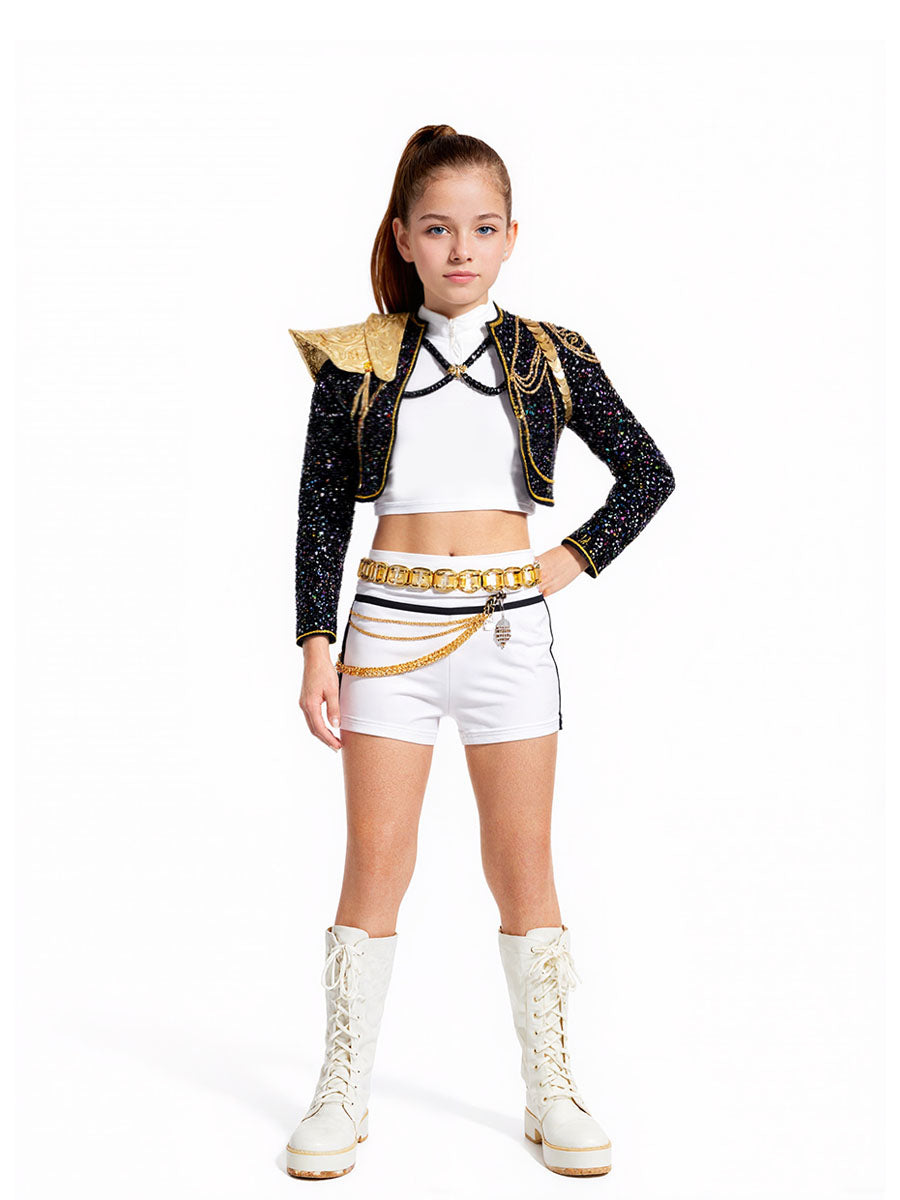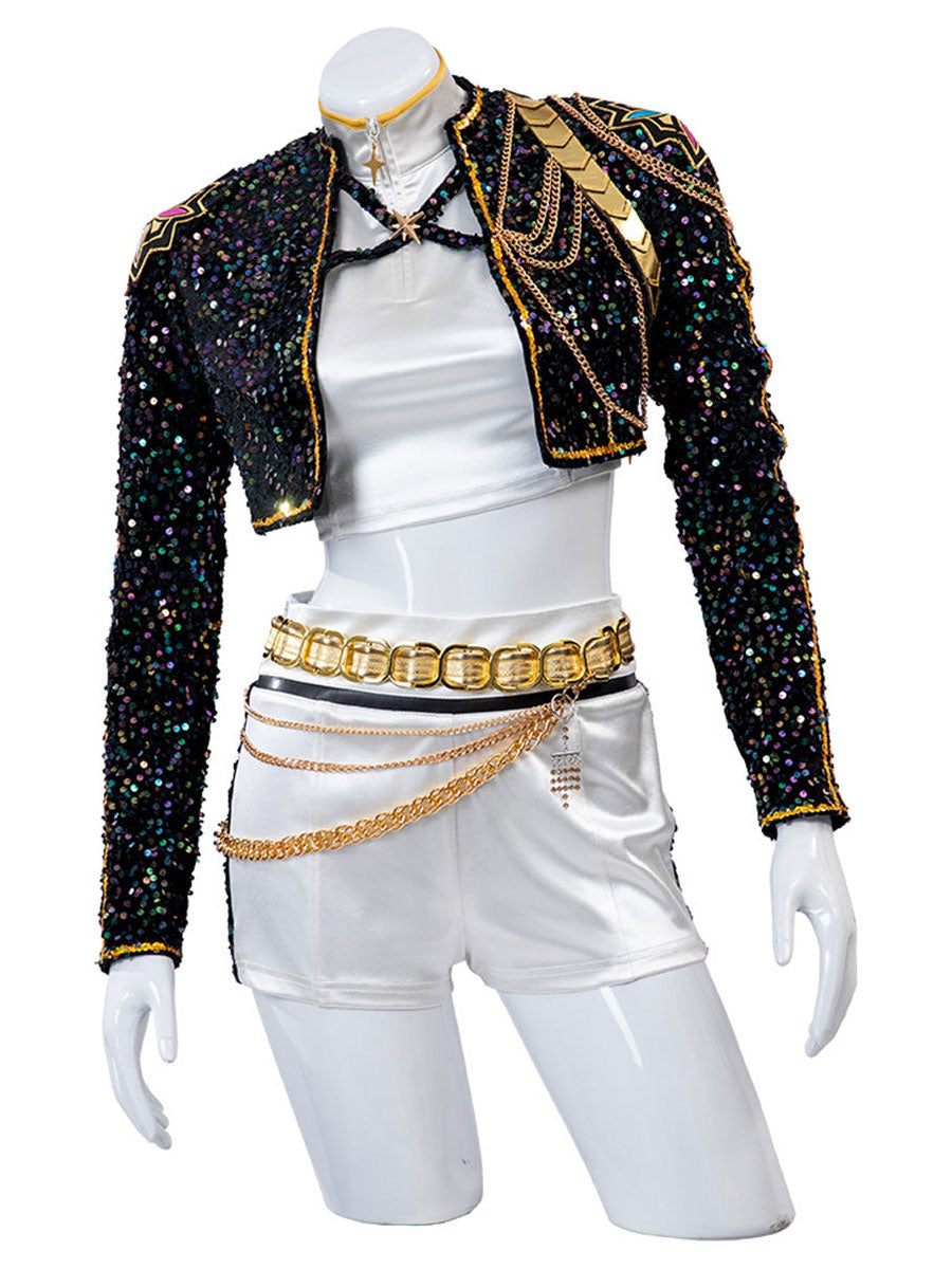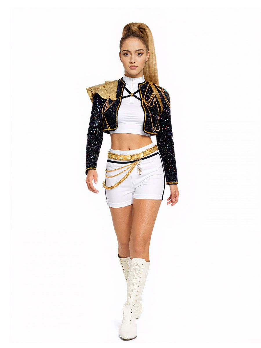 Design: Anime Super Idol Costume featuring a shimmering black sequin crop jacket with gold-trimmed epaulettes and chain accents, a white crop top, and a matching white high-waisted shorts, embellished with layered gold chains and a bold metallic belt, restores the roles character.
