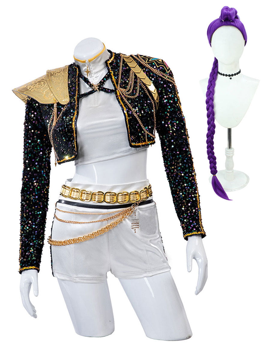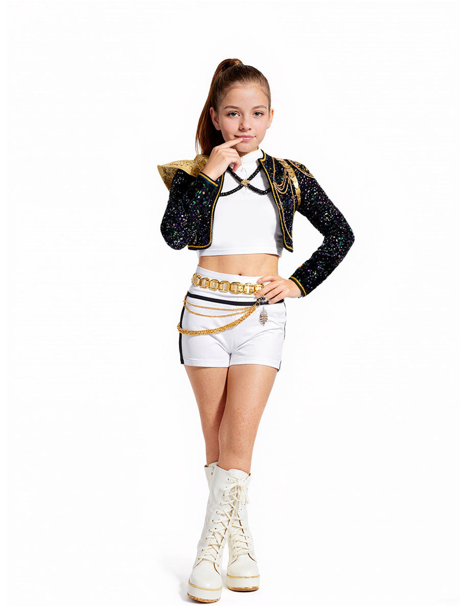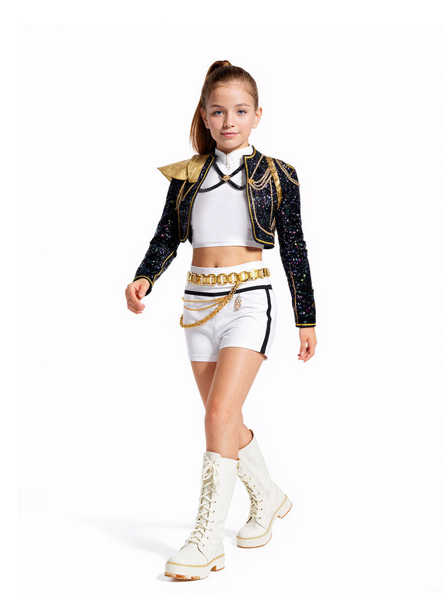 Design: Anime Super Idol Costume featuring a shimmering black sequin crop jacket with gold-trimmed epaulettes and chain accents, a white crop top, and a matching white high-waisted shorts, embellished with layered gold chains and a bold metallic belt, restores the roles character.
