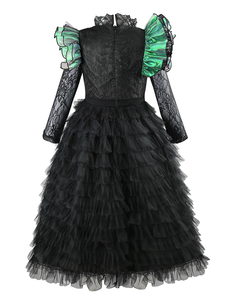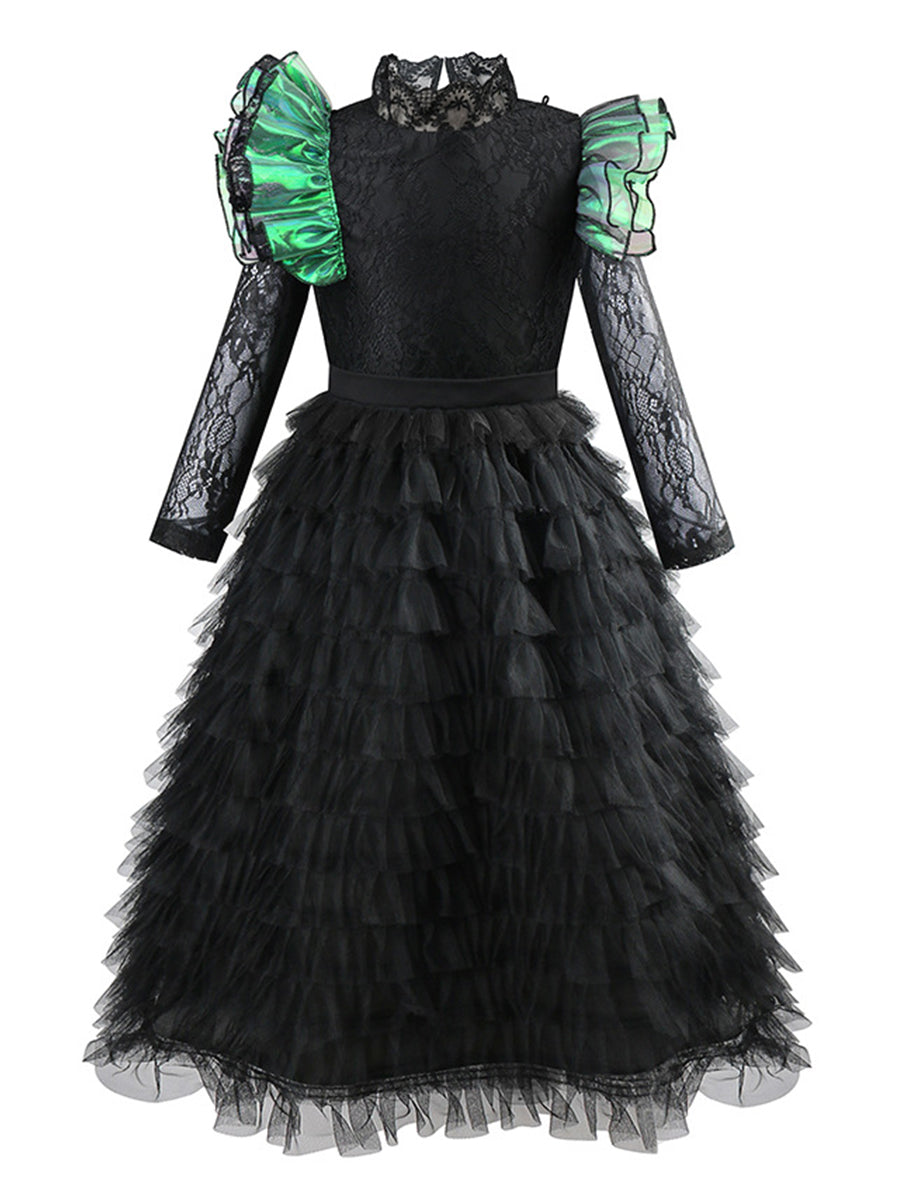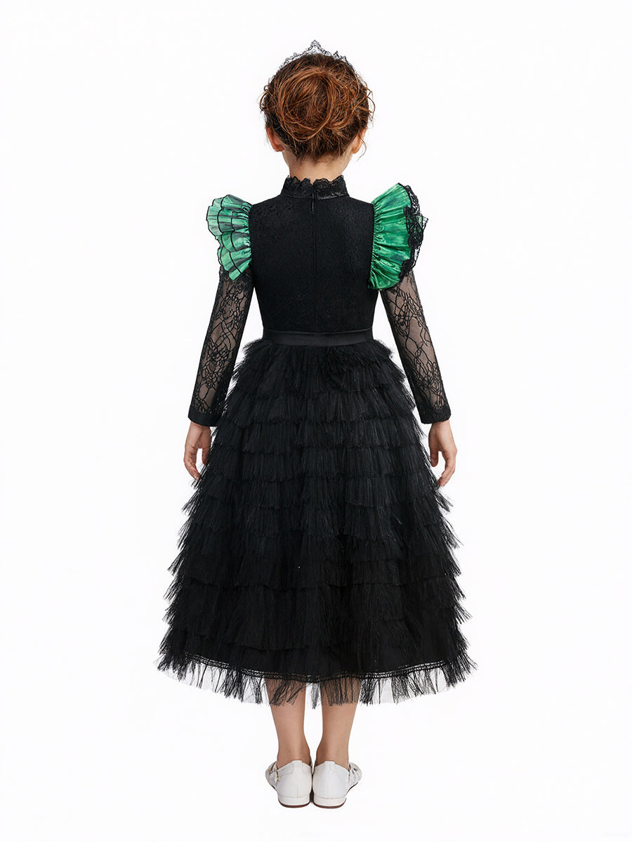 Design: Kids Wicked Elphaba Costume featuring a stunning black lace dress with dramatic green satin puff sleeves and a matching cape completes the look, making your little one feel like they’re ready to cast spells and fly on a broomstick.