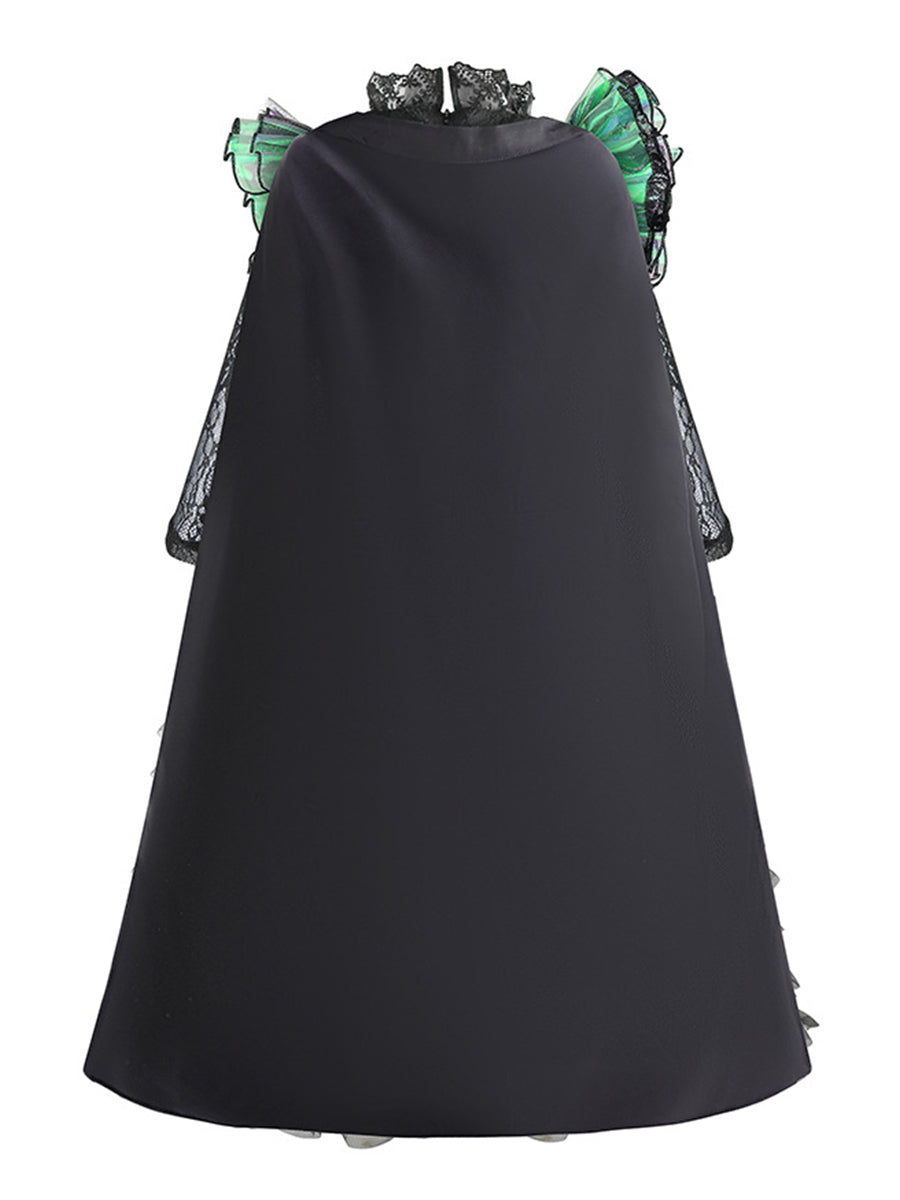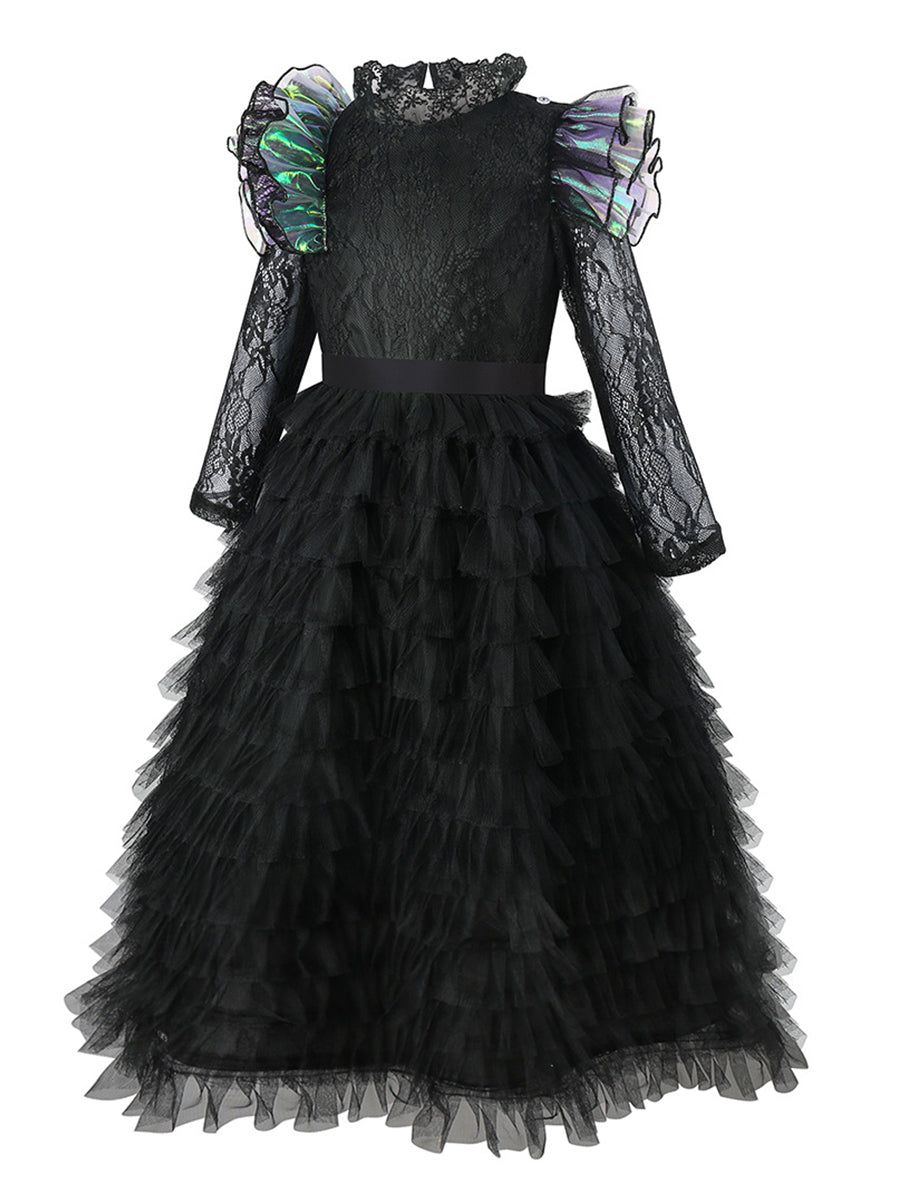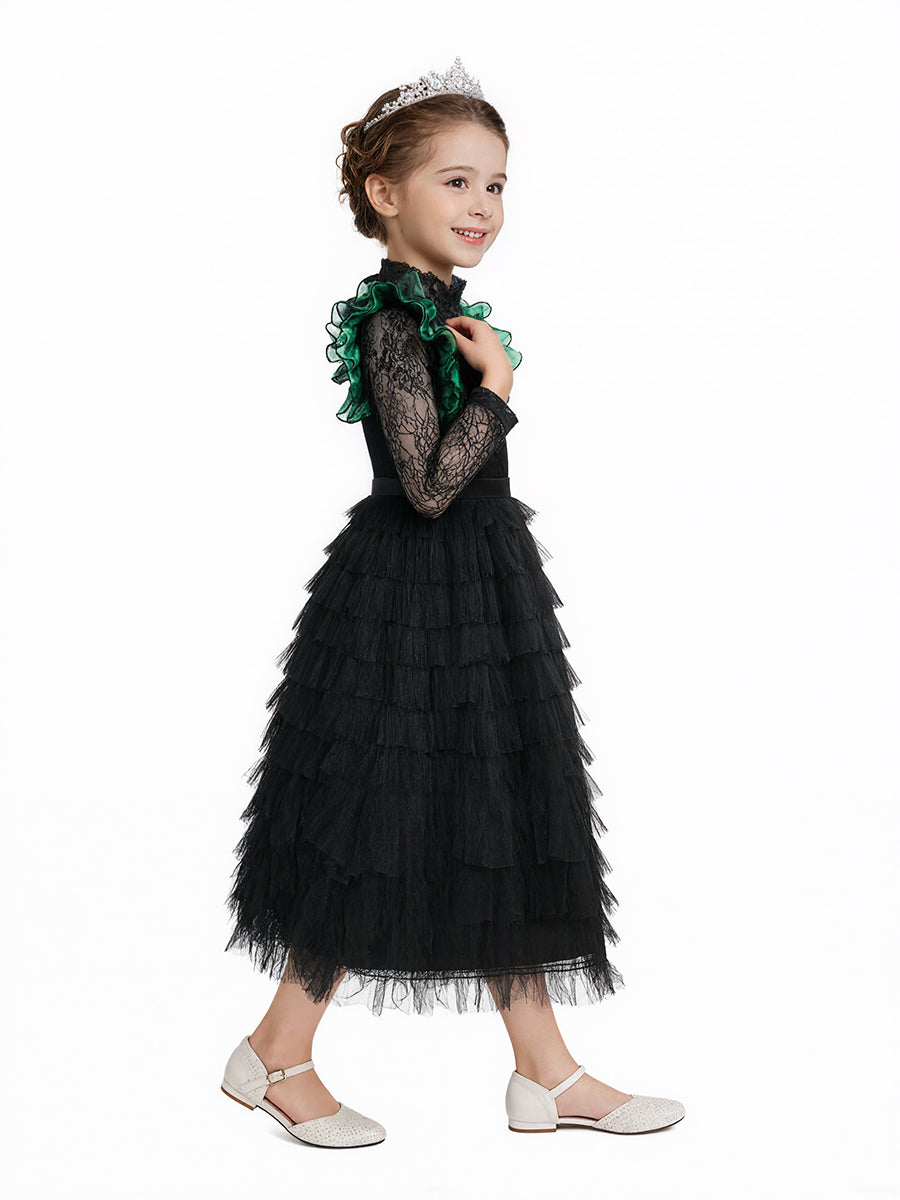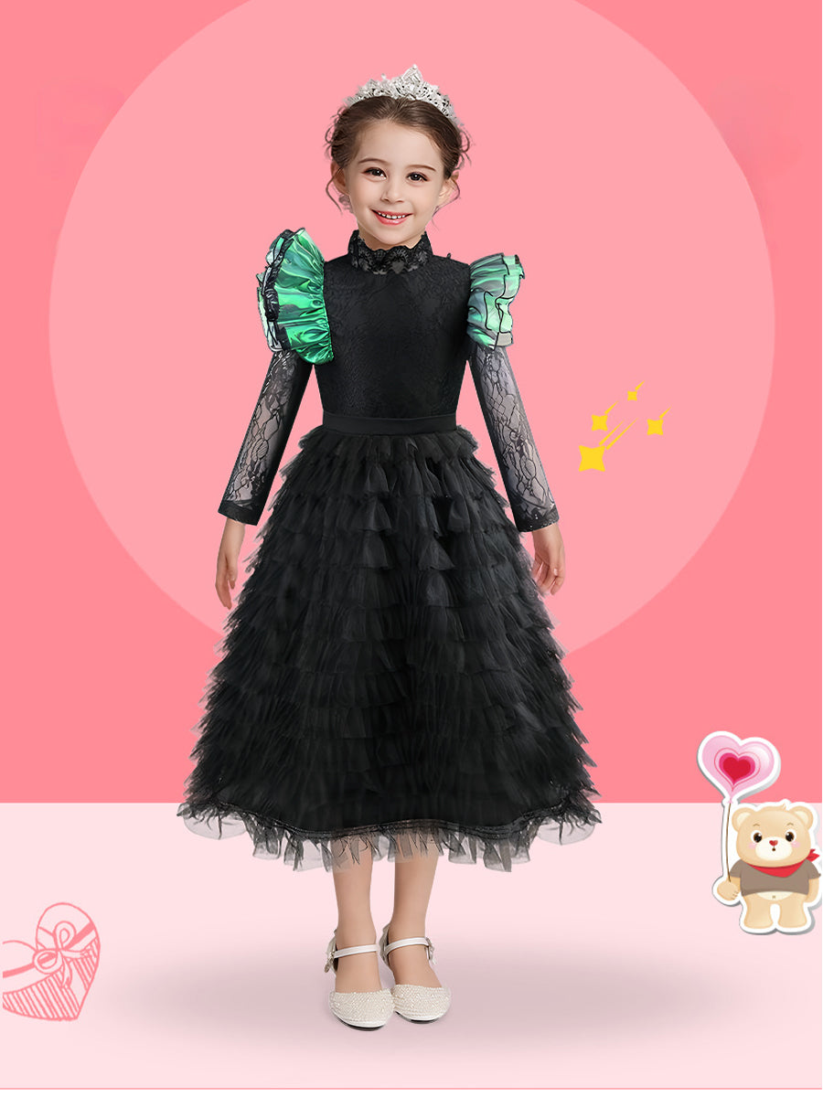 Design: Kids Wicked Elphaba Costume featuring a stunning black lace dress with dramatic green satin puff sleeves and a matching cape completes the look, making your little one feel like they’re ready to cast spells and fly on a broomstick.