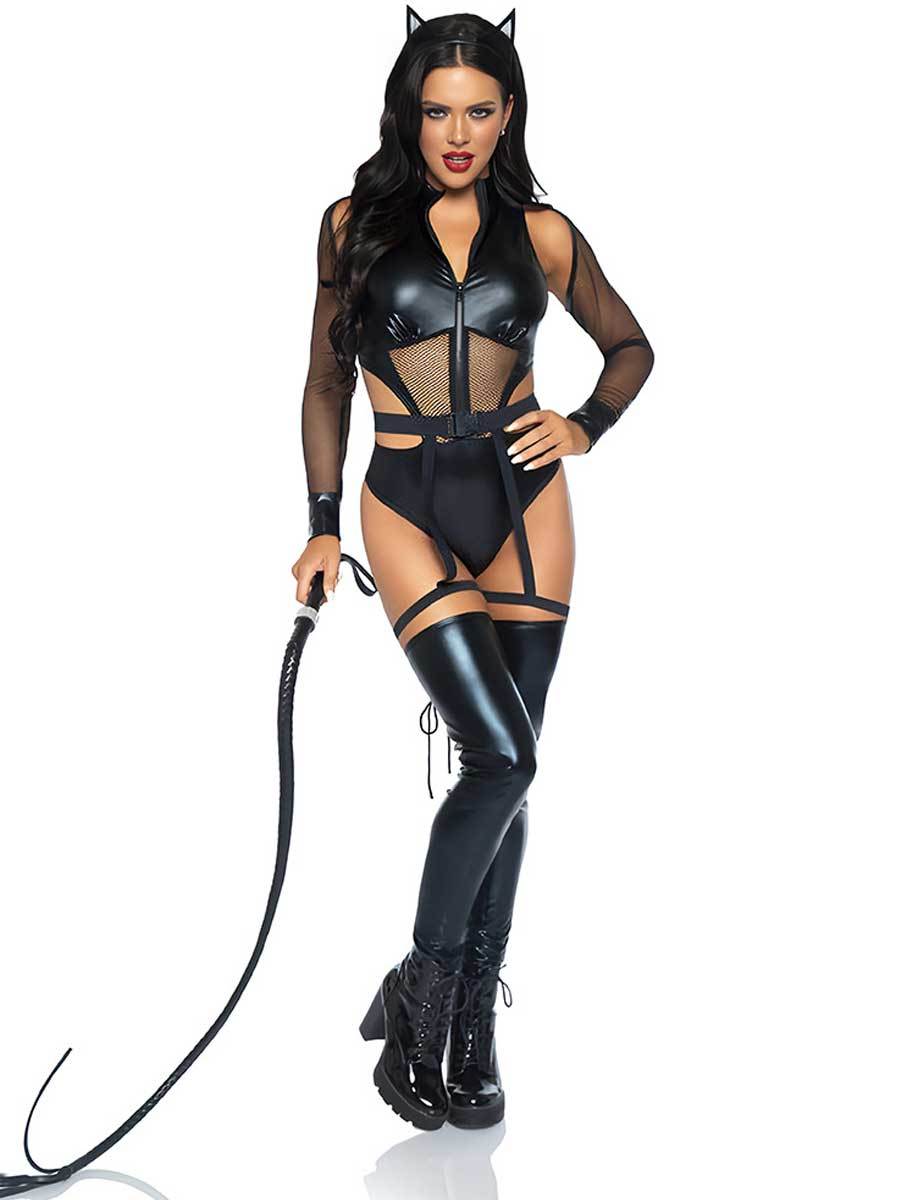 Design: Yomorio Sexy Catwomen Costume featuring black wet look bodysuit, front zipper up closure, sheer mesh panels, and It also comes with a cat-ear headband and a enticing bull whip to complete the Catwoman look.