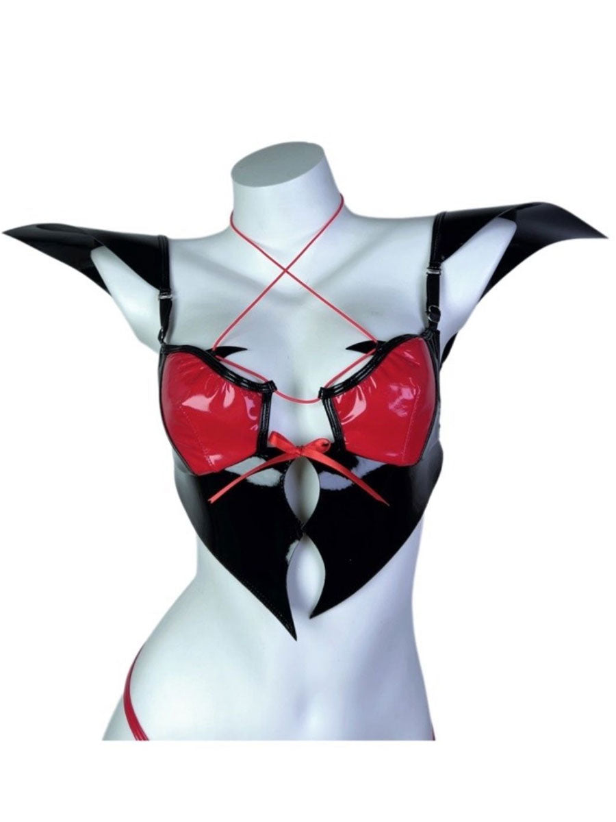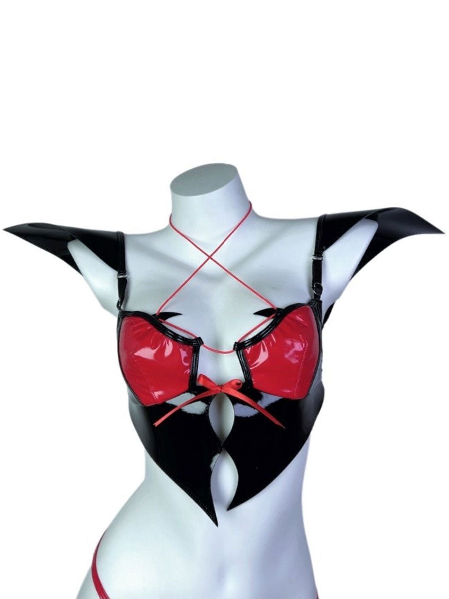 Design: Sexy Devil Cosplay Lingerie set features a black and red crop top, adjustable straps with ruffled trim, and red bow accents that enhance the daring aesthetic. The matching thong panty hugs your curves with a sleek, glossy finish, complete with a coordinating red bow detail.