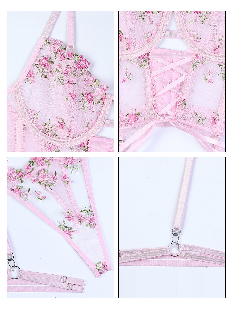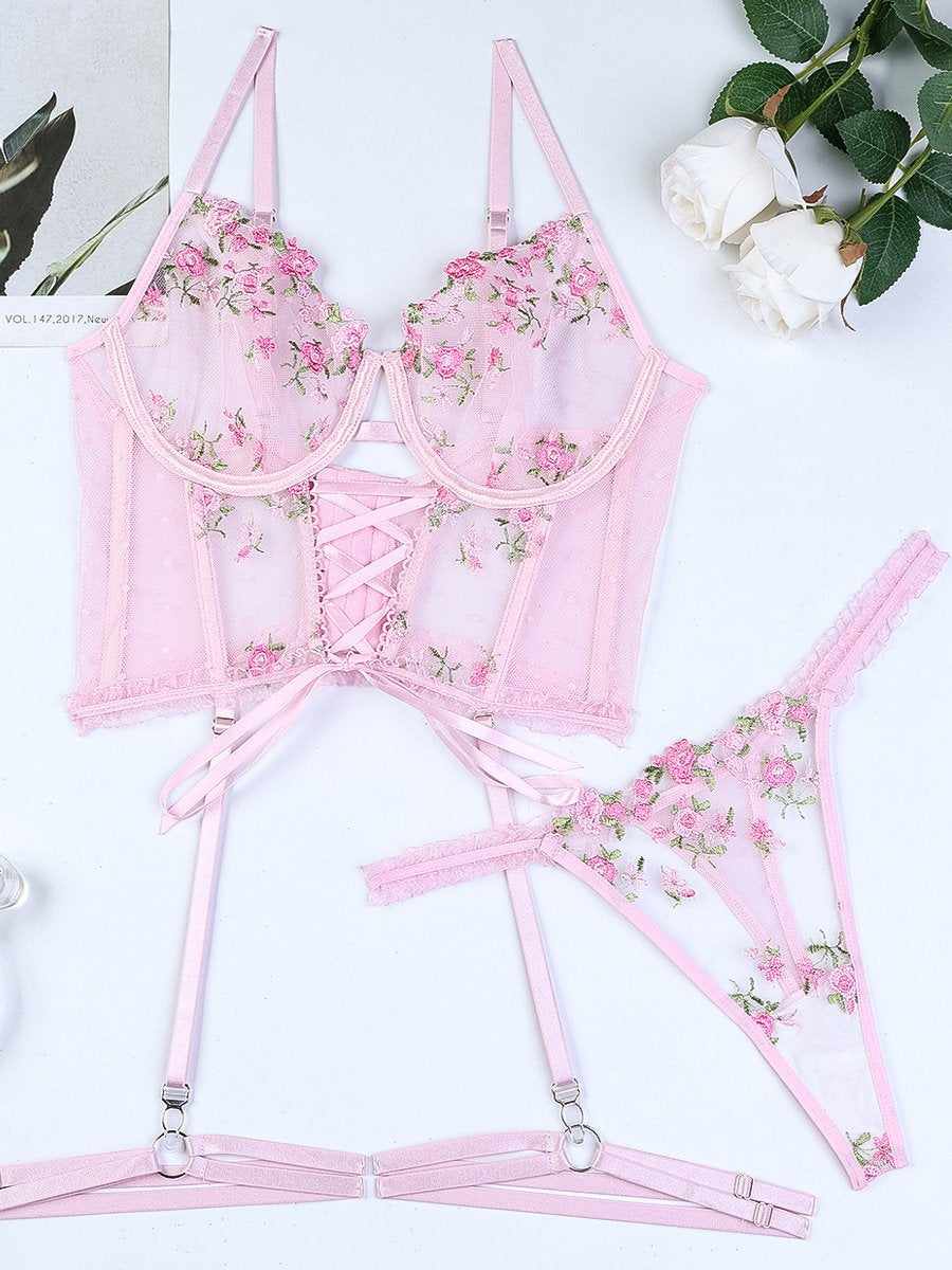 This super sexy lingerie set featurings sheer mesh underwire cups with embroidery floral details, adjustable spaghetti straps, a hook and eye back closure, adjustable garter straps, and adjustable leg garters, and a matching mesh thong. You'll feel irresistible in this set, designed to make you look and feel your best.