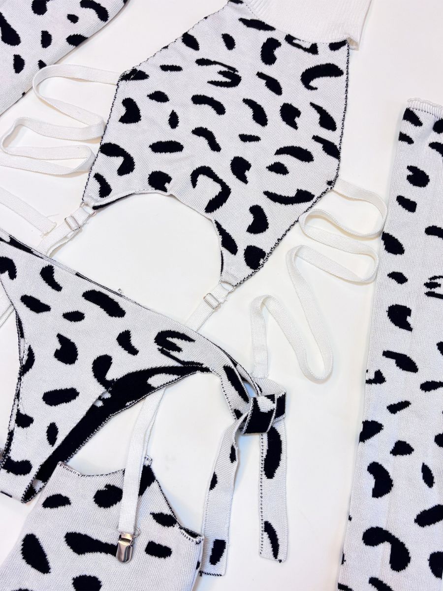 Design: Yomorio sexy cow print cosplay lingerie show your perfect body curve. Turtleneck style, an open back, attached adjustable garter straps, Complete the look with matching thigh high stockings and a thong cut panty with side tie closures for a touch of playfulness.