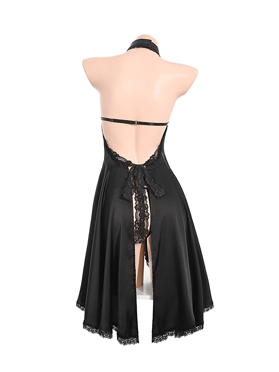 Design: Women's Devil Costume features a black slit dress with halter neckline, strappy chest accents, black lace trim, and a flattering front slit. The back is tied with adjustable straps for a perfect fit, revealing the accompanying lace thong with beaded heart detail. Complete the look with the included glossy black demon horn headband for a playful, daring twist.