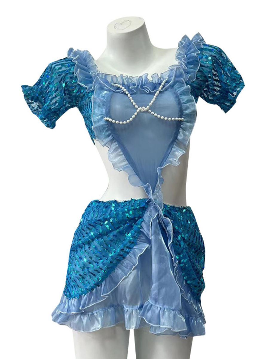Design: Yomorio Sexy Mermaid Cosplay Costume featuring transparent mesh heart design framed by soft ruffles and delicate pearls, off shoulder sleeves, and glittering sequins and ruffled trim evoke the fantasy of deep-sea treasures.