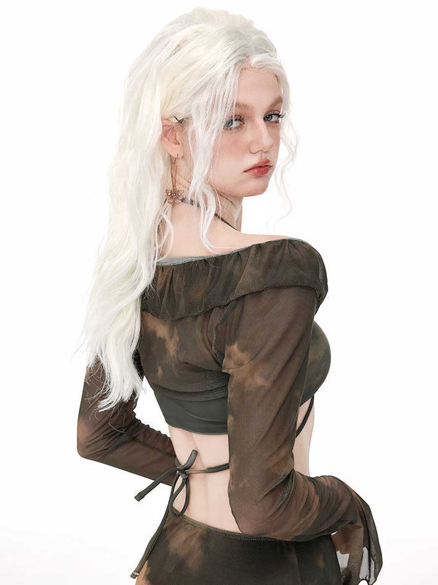 Design: This 4 piece bikini set featuring adjustable straight ruched cups, a strappy underbust, and matching bottoms with a low rise front panel, side tie closures, a thong cut back, and a sheer mesh cover-up shirt with a tie closure, flared long sleeves, and a cover-up skirt, an asymmetrical hem with a ruffled trim.