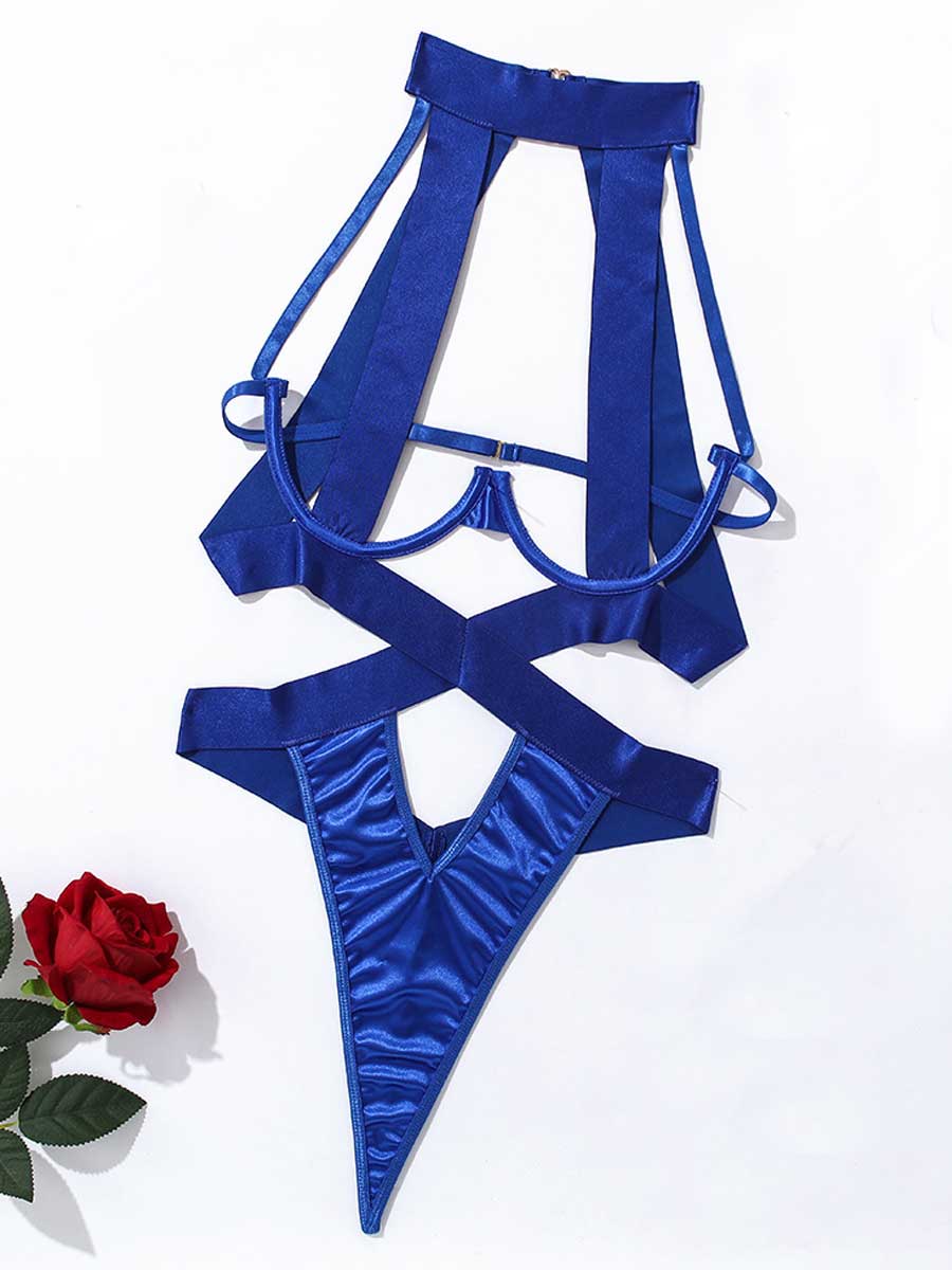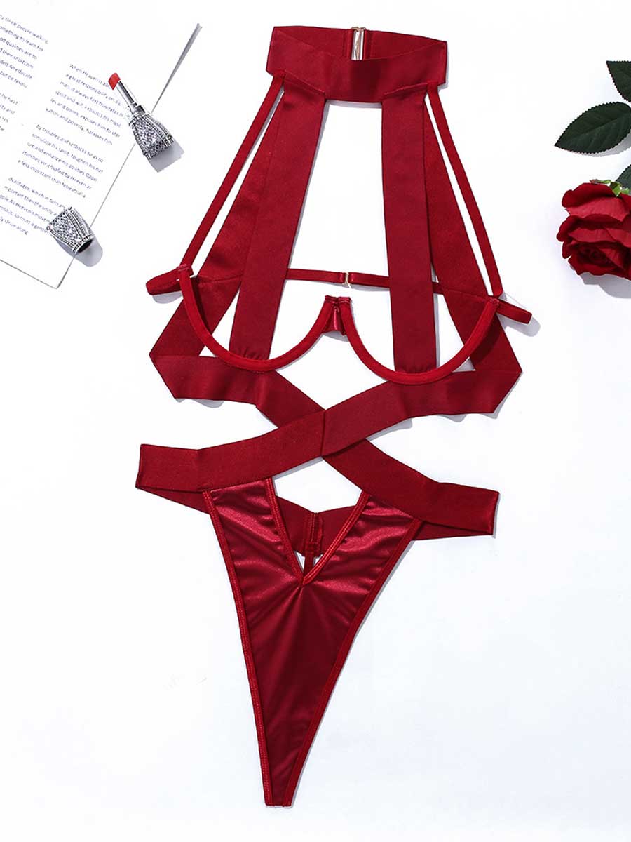 Design: This sexy bandage bodysuit featuring underwire cups with wide straps detailing, a halter neckline with hook and eye back closure, a strappy open bodice, a high cut leg, and a g-string cut back.