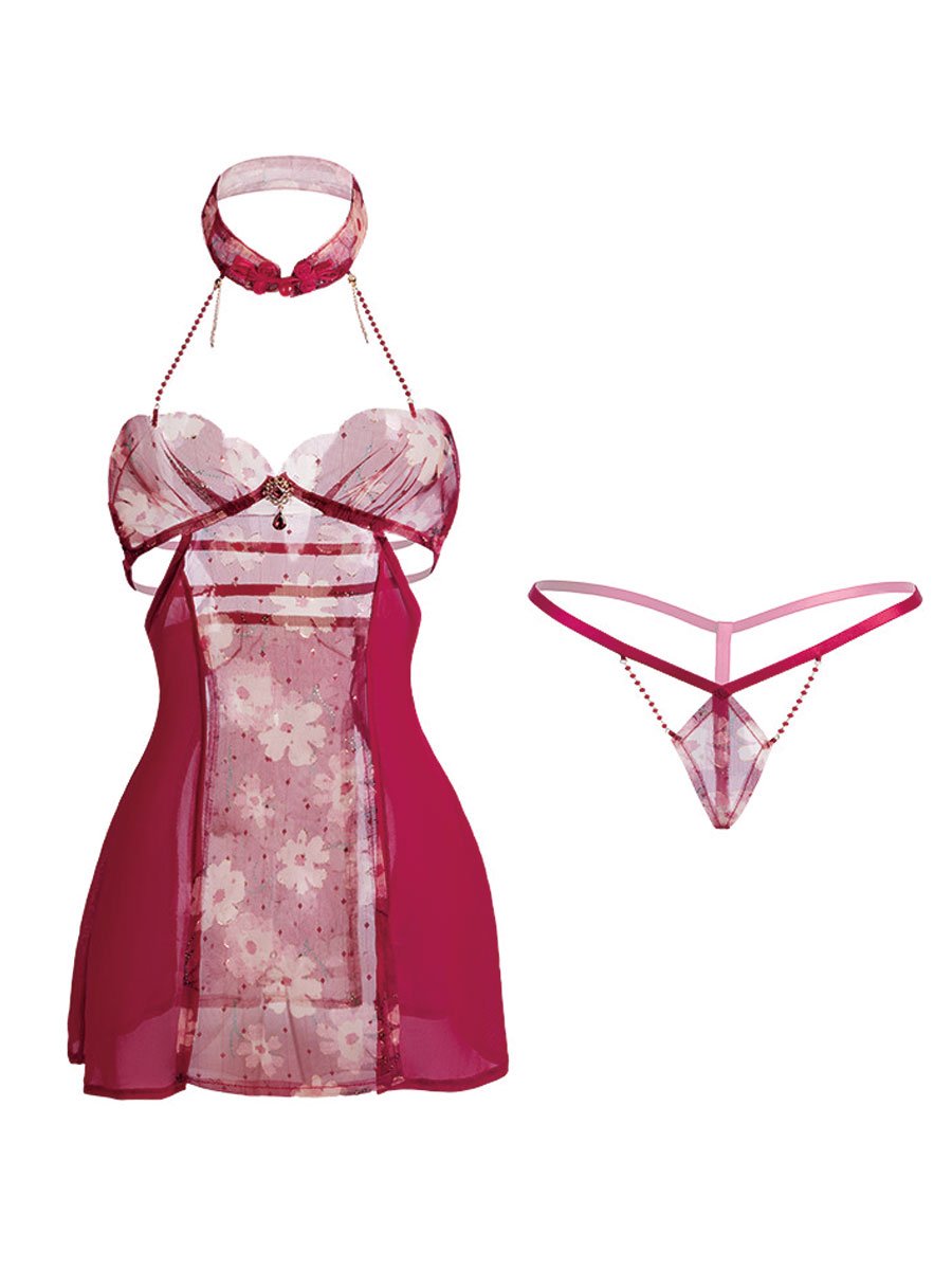 Design: Yomorio Sexy Transparent Chinese Lingerie Dress featurings halter neckline, traditional chinese buckle closure, sheer mesh bodice with floral print, the length of the cheongsam can't completely cover the buttocks, which is extremely sexy.