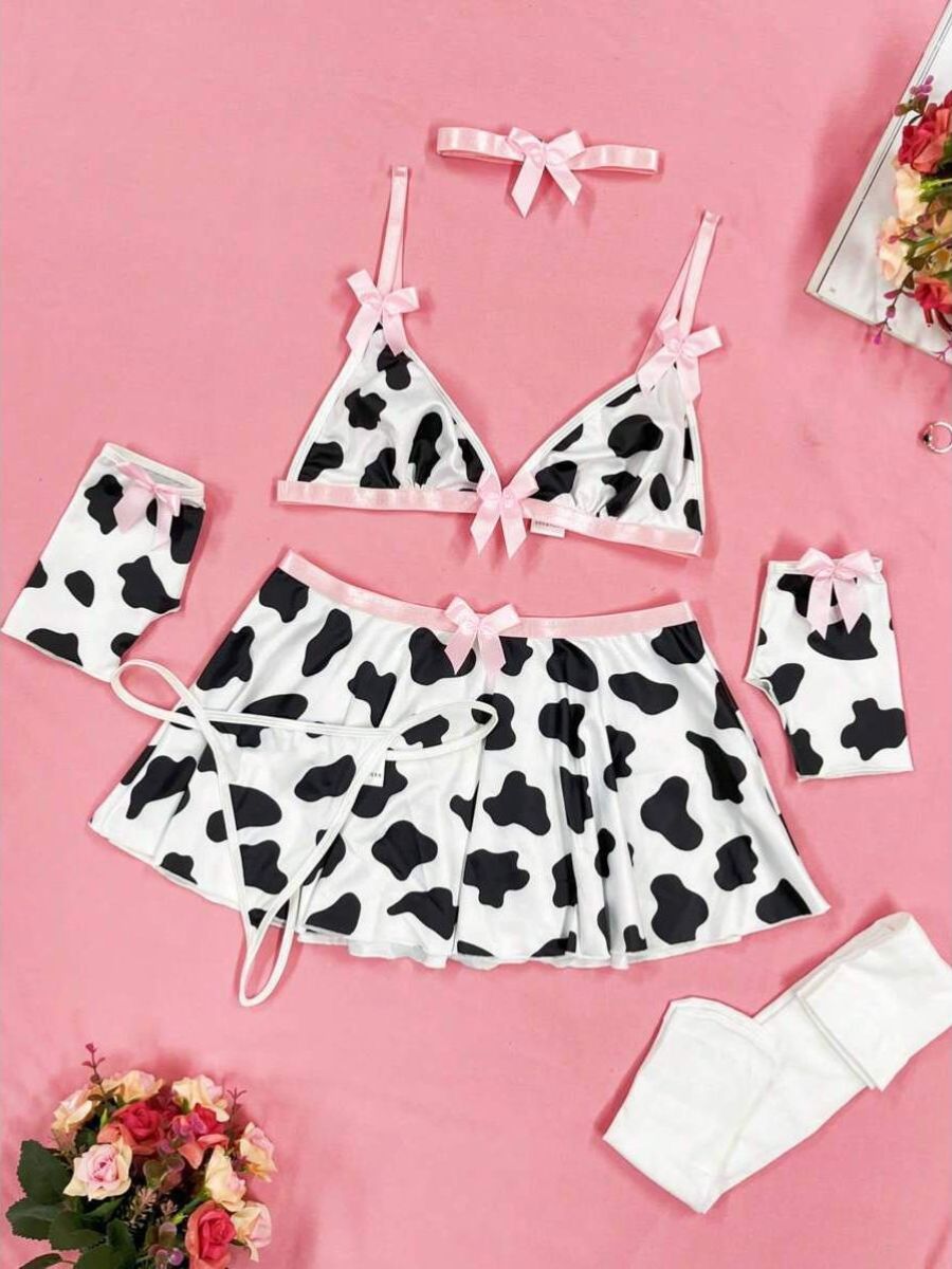 Design: Yomorio Sexy Milk Cow Cosplay Costume features: a micro triangle bra with adjustable spaghetti straps, Black and white spots pattern, high waist mini skirt, feel this cute animal role-playing suit brings different feeling.