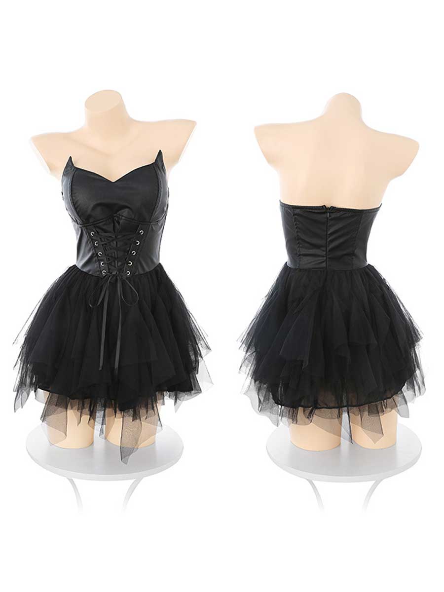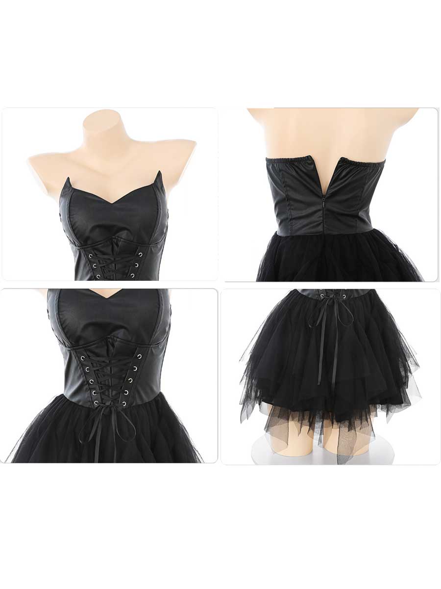 Design: Rock out in this wet look mini dress, offering a little more coverage while still remaining sexy. This Succubus Outfit featuring strapless mini dress, front lace-up design and back zipper up closure, this curve-hugging design includes a mini hemline and sheer mesh panels.