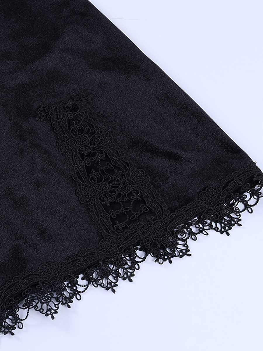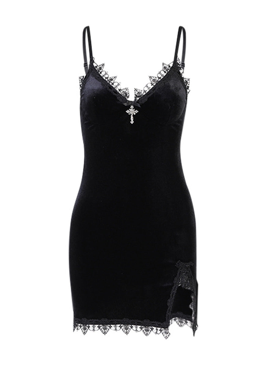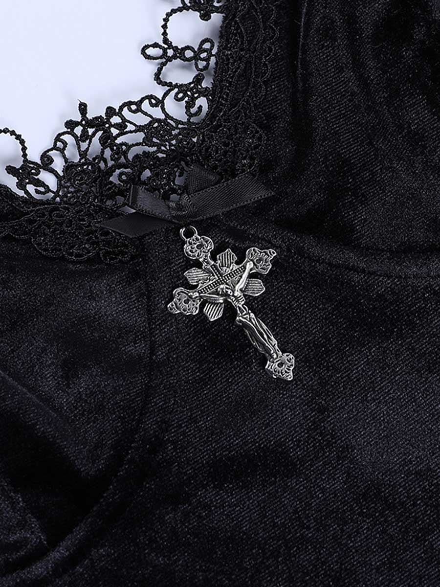 Design: Velvet Gothic Style Costume features a black mini dress, adjustable spaghetti straps, metal cross pendant accents, a fitted bodice with black lace trim, and a side slit hemline, this is a cute and sexy costume designed to make you look more charming.