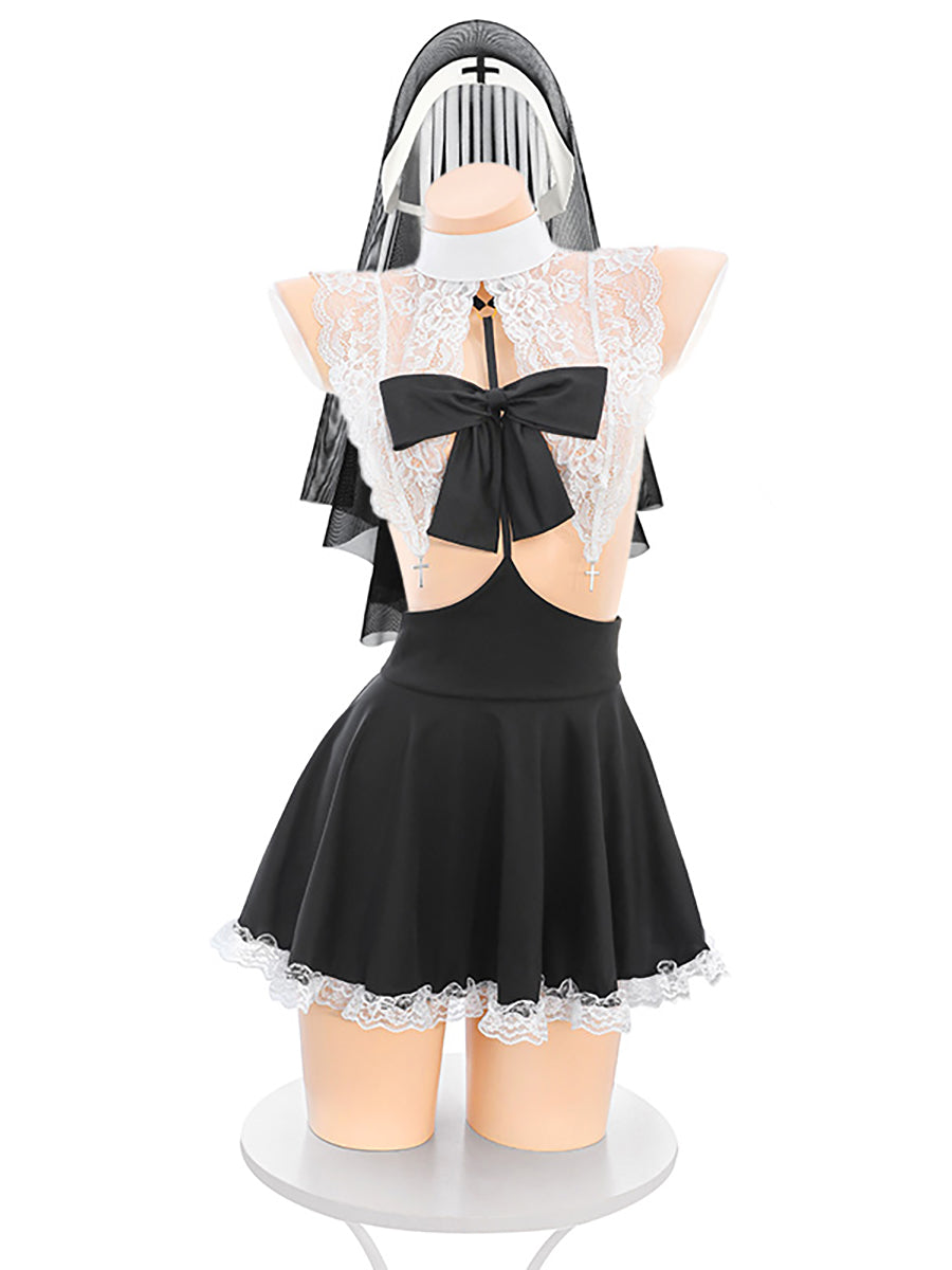 Design: This sexy nun habit cosplay lingerie featuring a sultry halter-style mini dress, open bodice design, a dramatic oversized black bow, white lace collar, this outfit redefines traditional themes with a seductive twist, an attached flared mini skirt is trimmed with delicate lace, and a matching nun habit veil, Perfect for a night of cosplay and role-playing fun with friends.