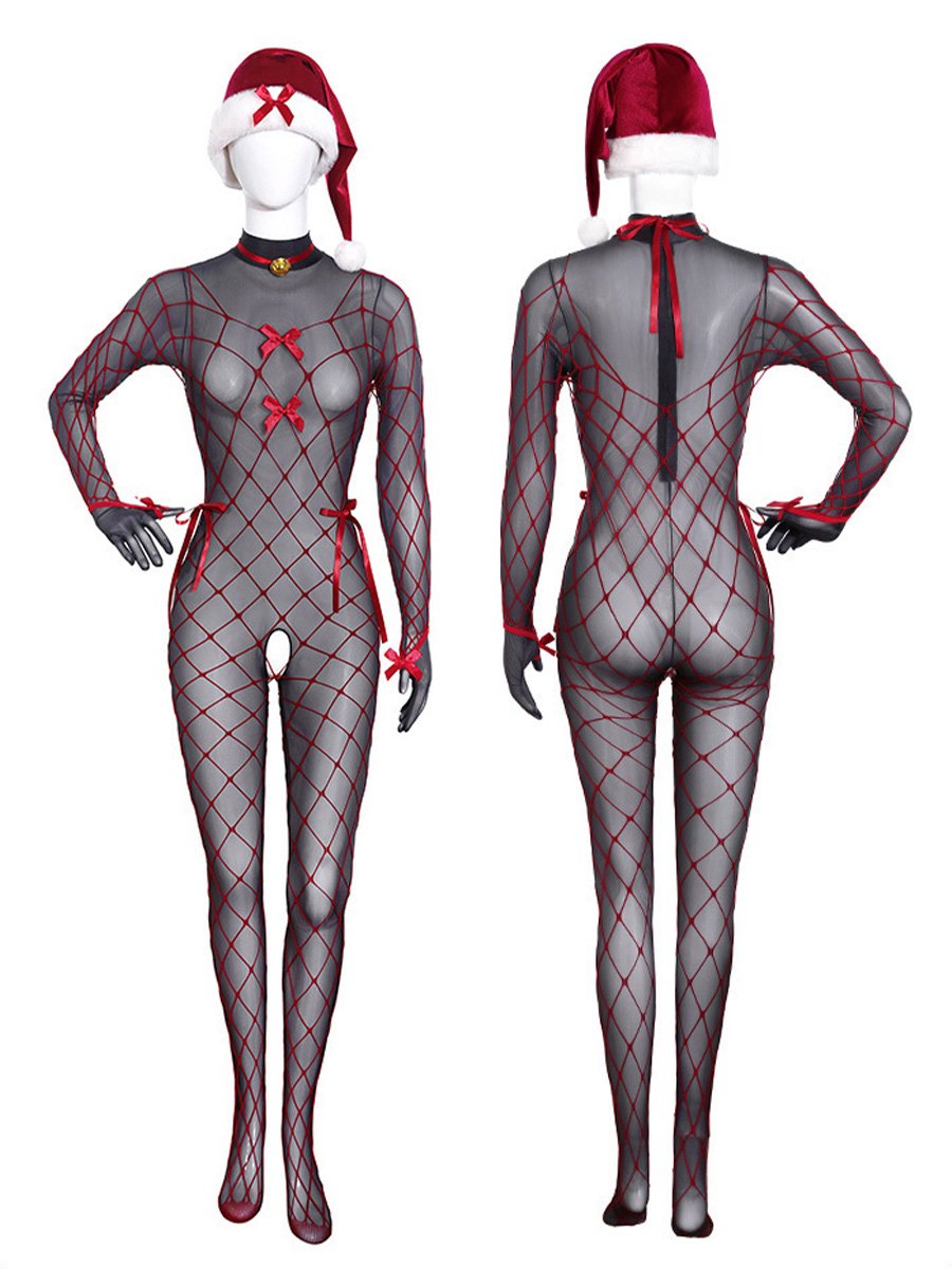 Design: This Sexy Christmas Outfit features a red velvet fishnet bodystocking, red bow accents, a velvet aanta hat, and a matching black mesh crotchless bodystocking, it thoroughly shows off your stunning curves.