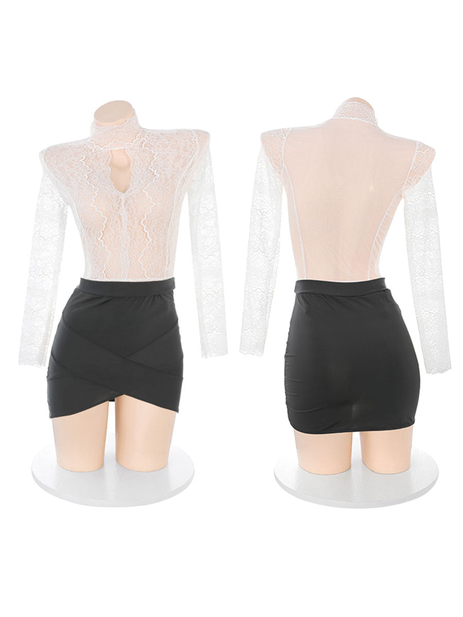 Design: This office lady role-playing outfits features: Sheer lace long sleeved top with a keyhole, and a matching mini skirt, a curve-hugging wrapped hem with a mini length, to show off your ultra-sexy and chic figure. Comfortable room in the butt and thighs make you easy to walk around.