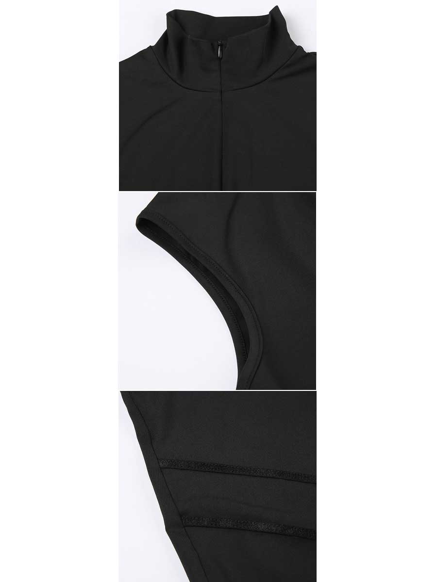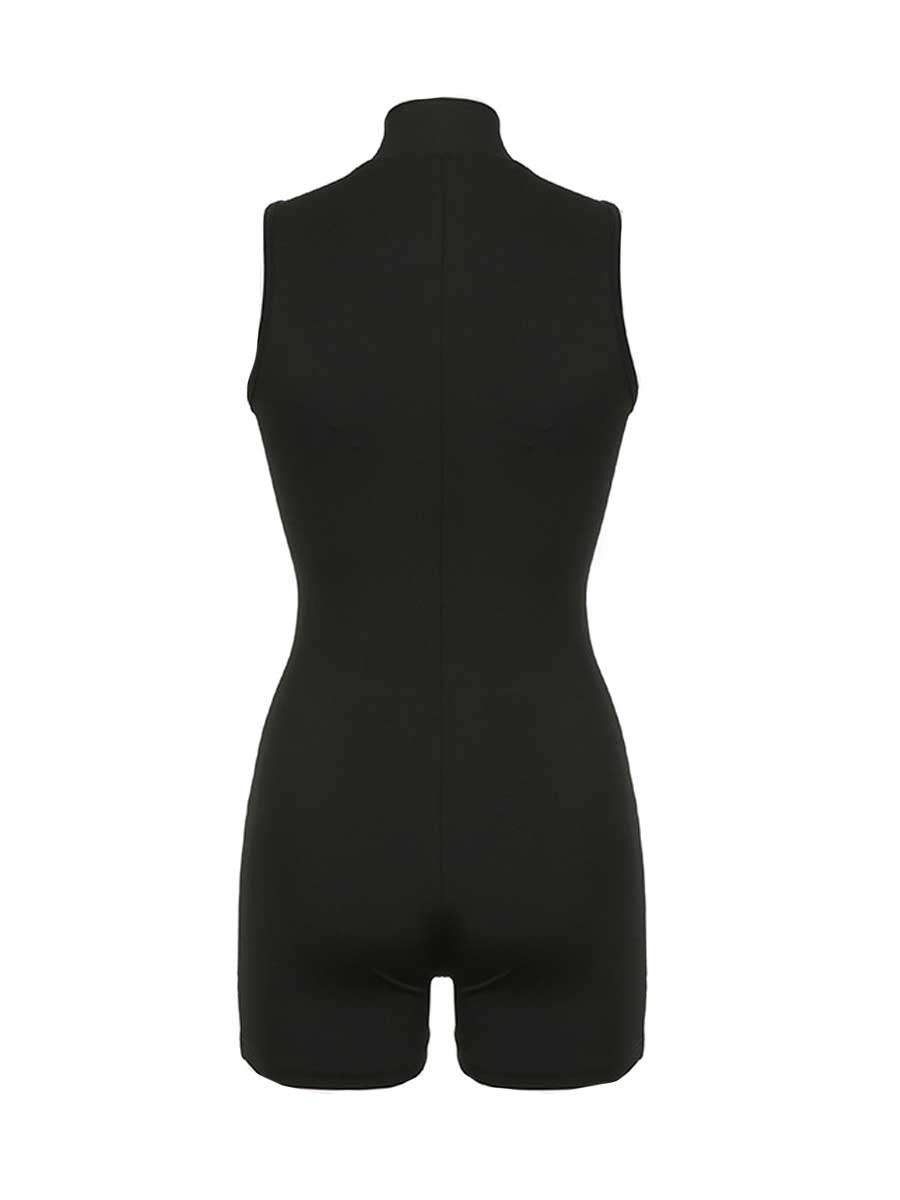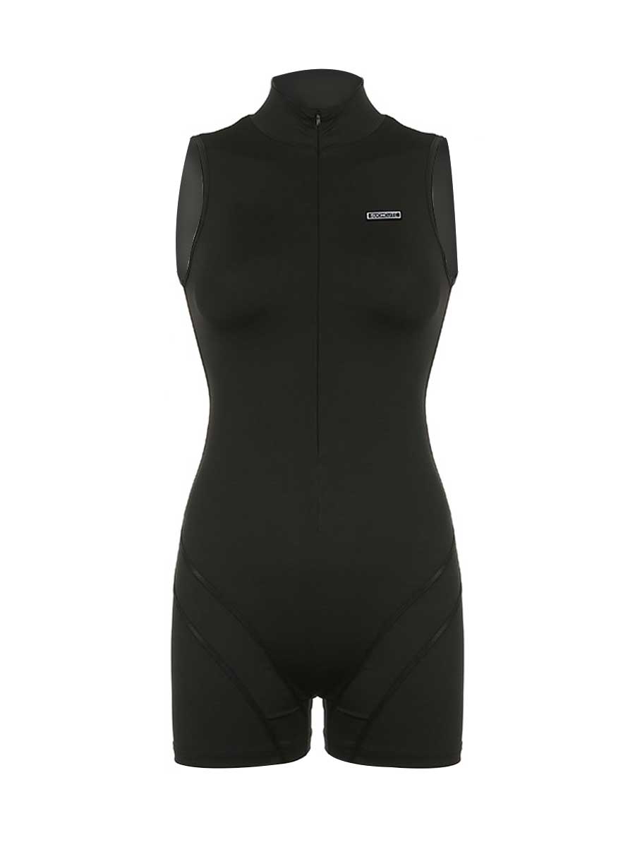 Design: This seductive fitness romper featuring a high collar with front zipper up detailing, a fitted bodice, and fitted short legged.
