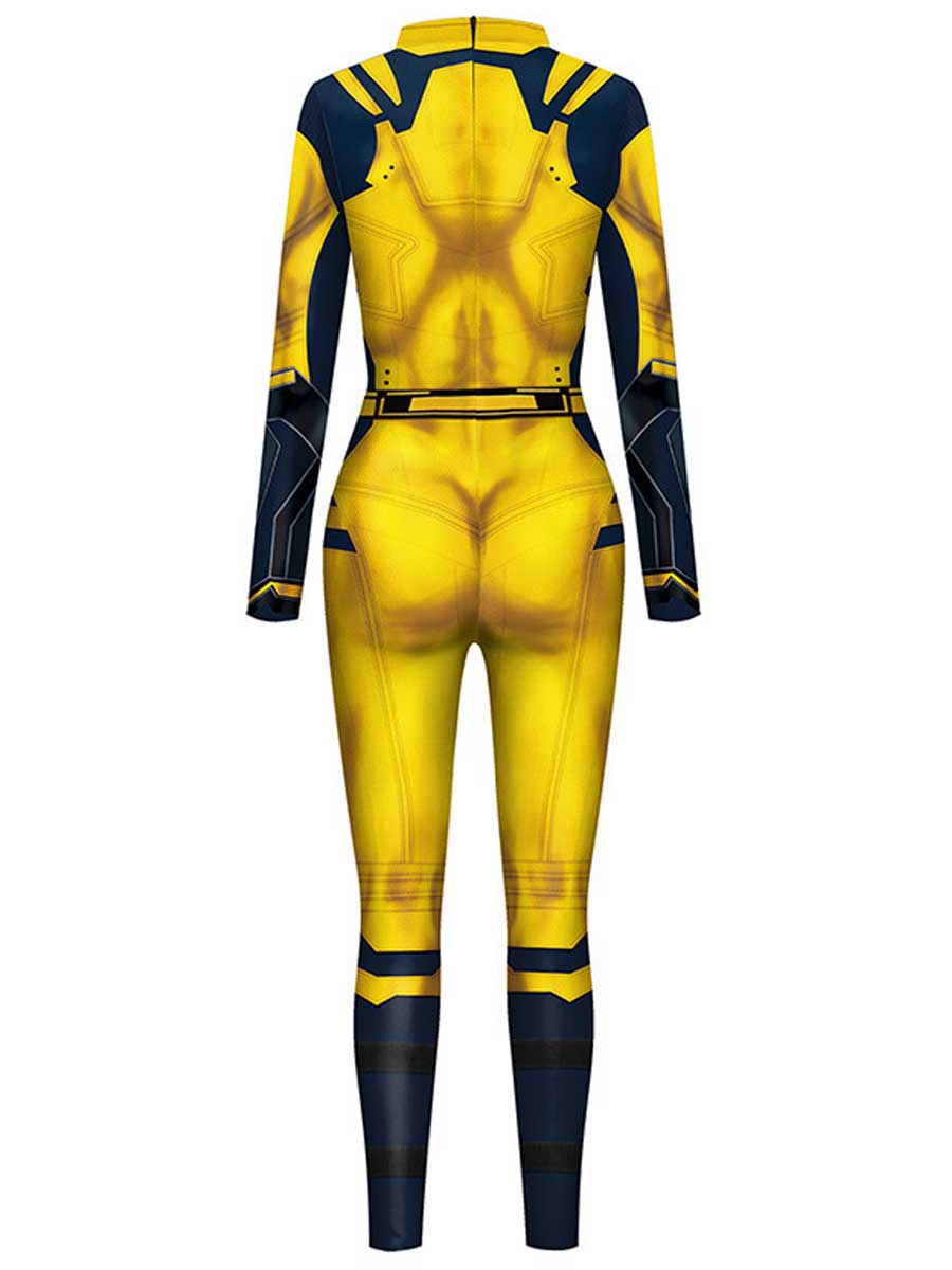 Design: Superheros Role-playing Cosplay Costume featuring a full body jumpsuit with a high neckline, long sleeves, back zipper up closure, fitted legs, an allover 3D printed design, restores the roles character.
