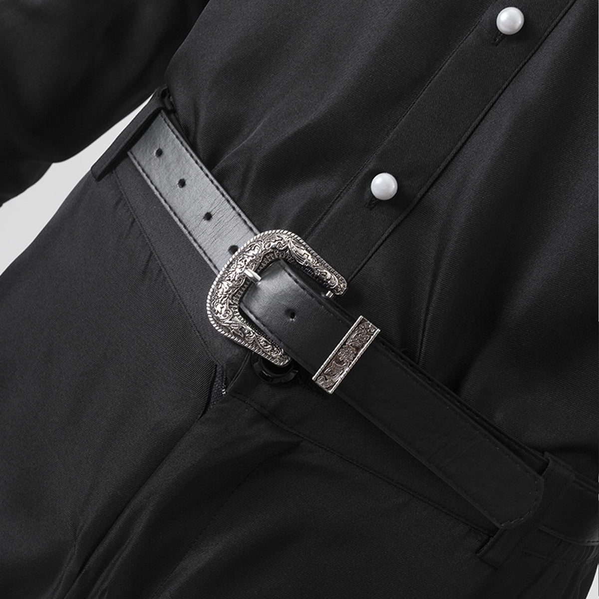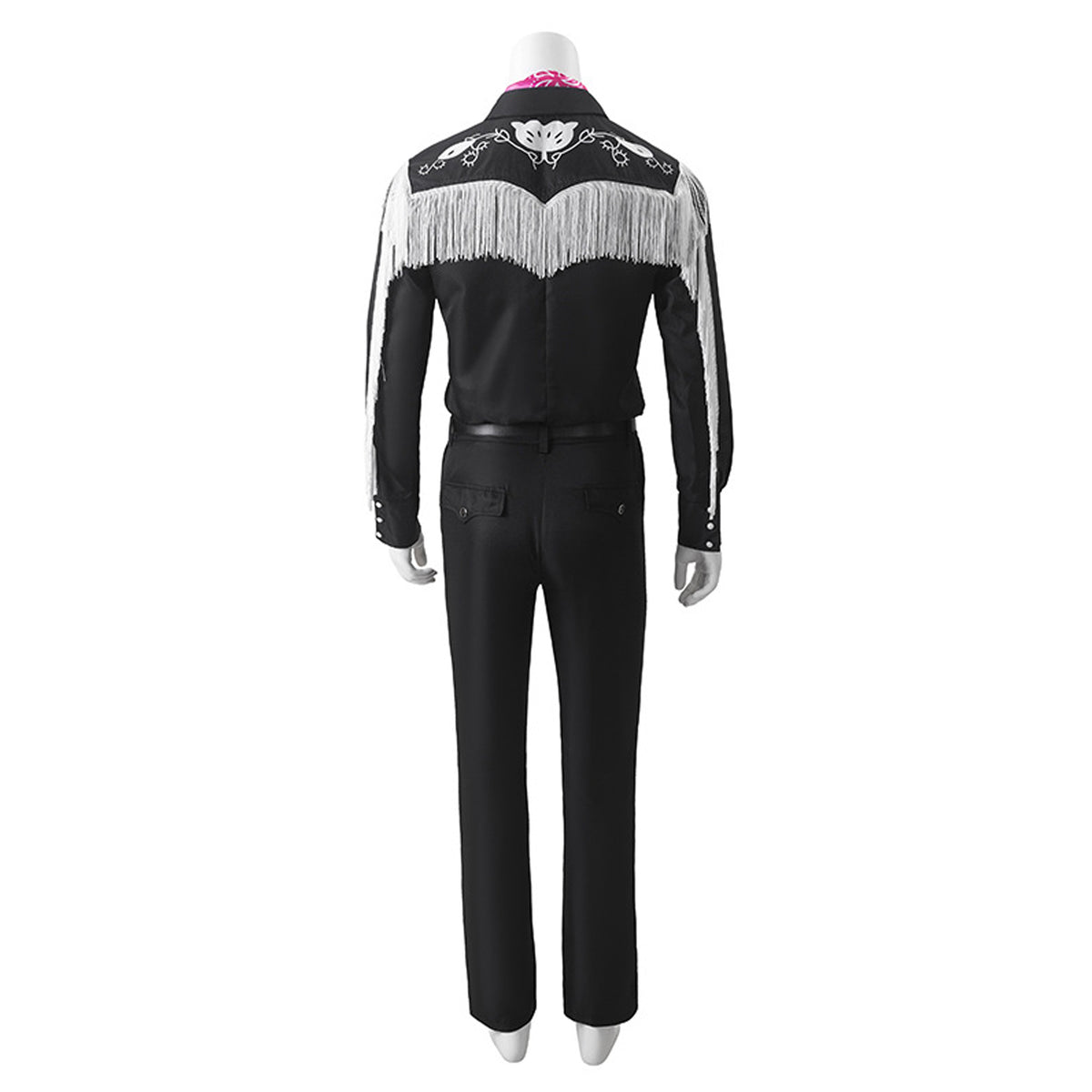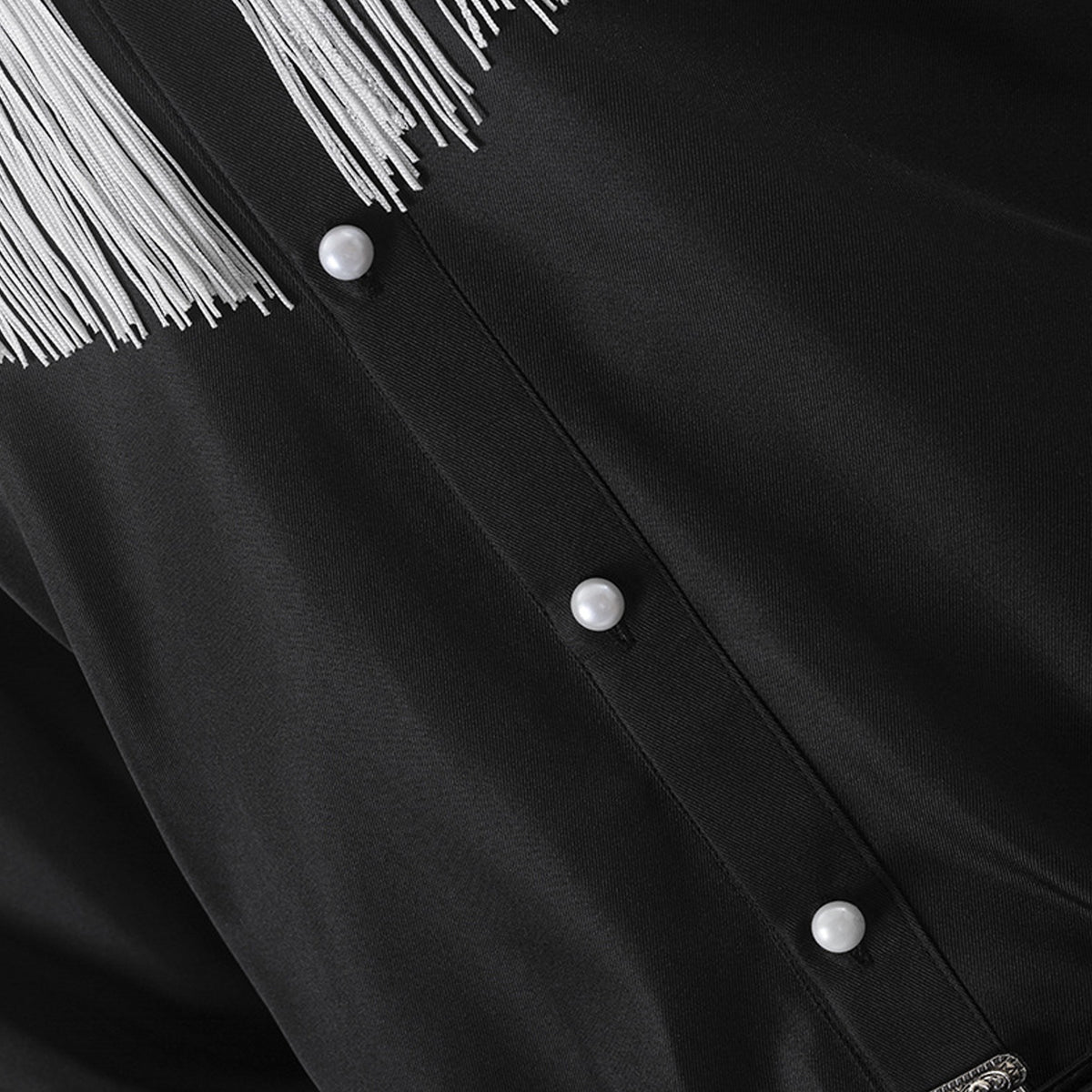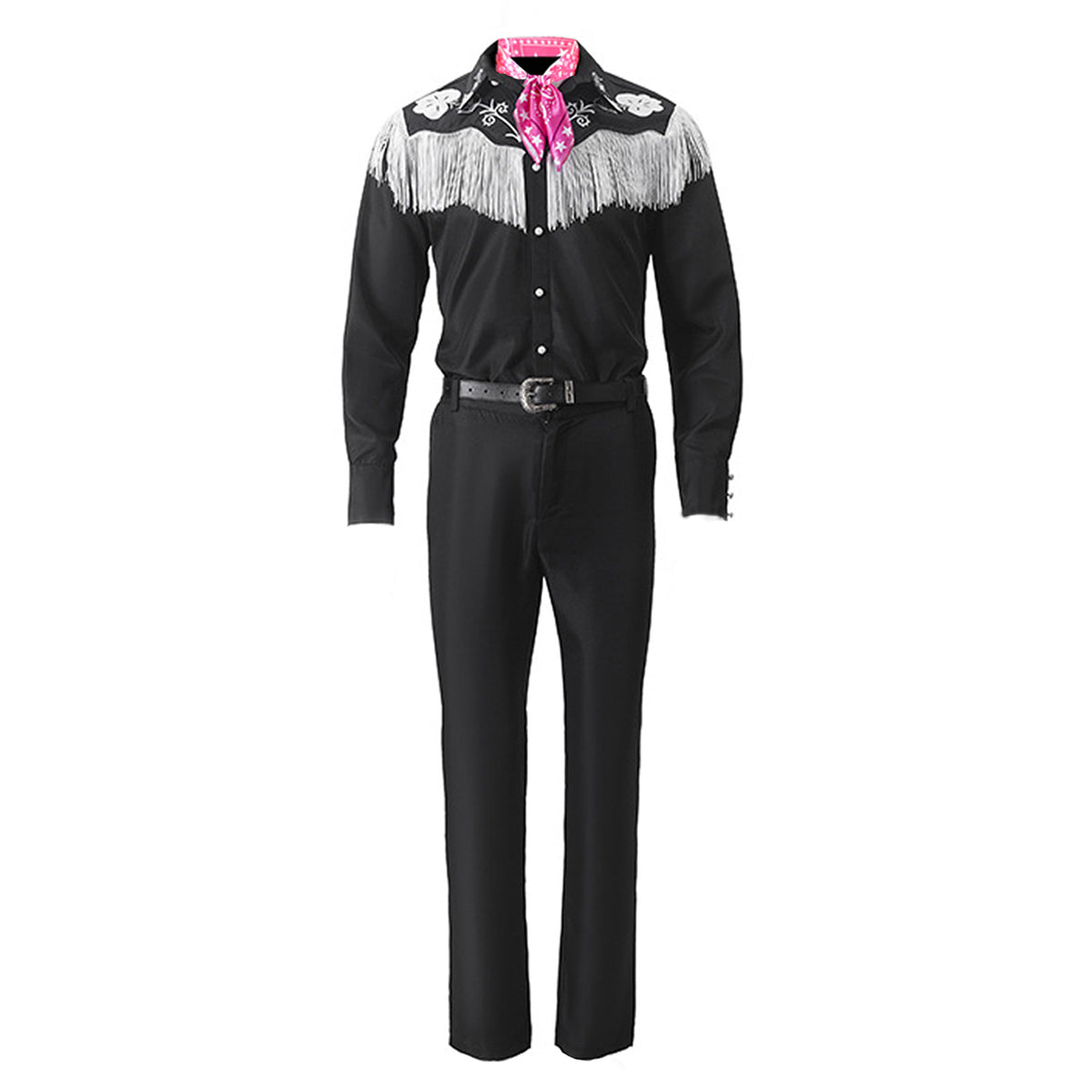 - Adult Cowboy Costume - Black shirt with fringe and Printed flower on front yoke above fringe and along underarm sleeve seams for a western vibe.