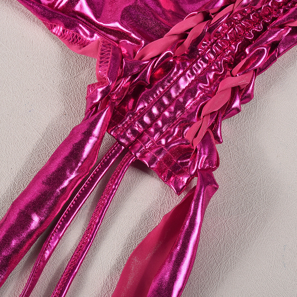 Yomorio Metallic Skirt Set Pink Two Piece Set Sexy Party Clubwear Drawstring Rave Outfits