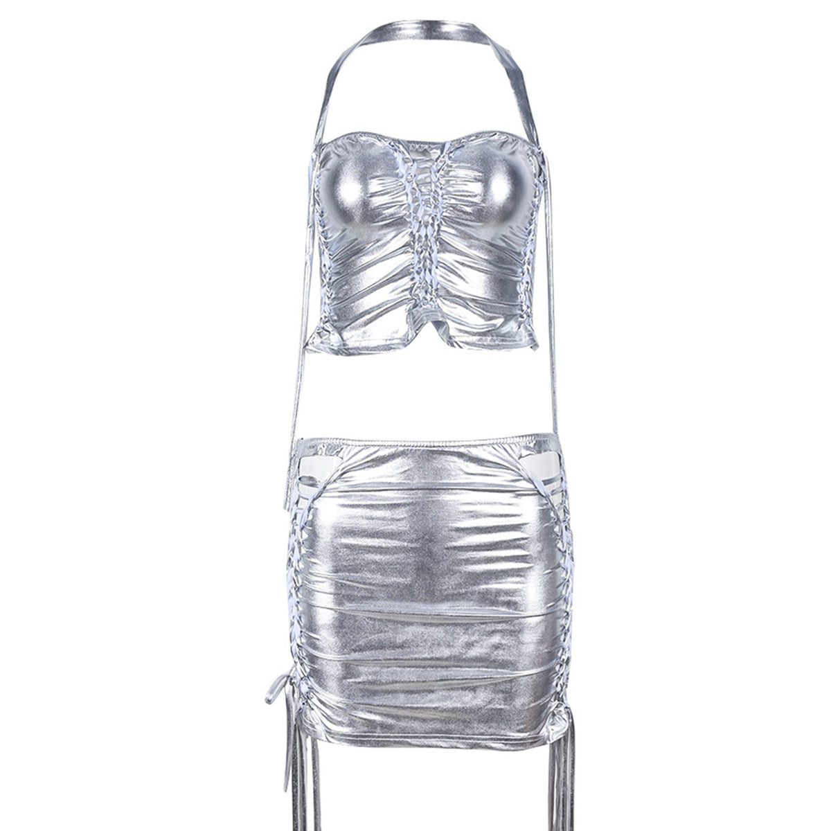 • Yomorio metallic two piece skirt set featuring halter crop top, and a matching mini skirt.