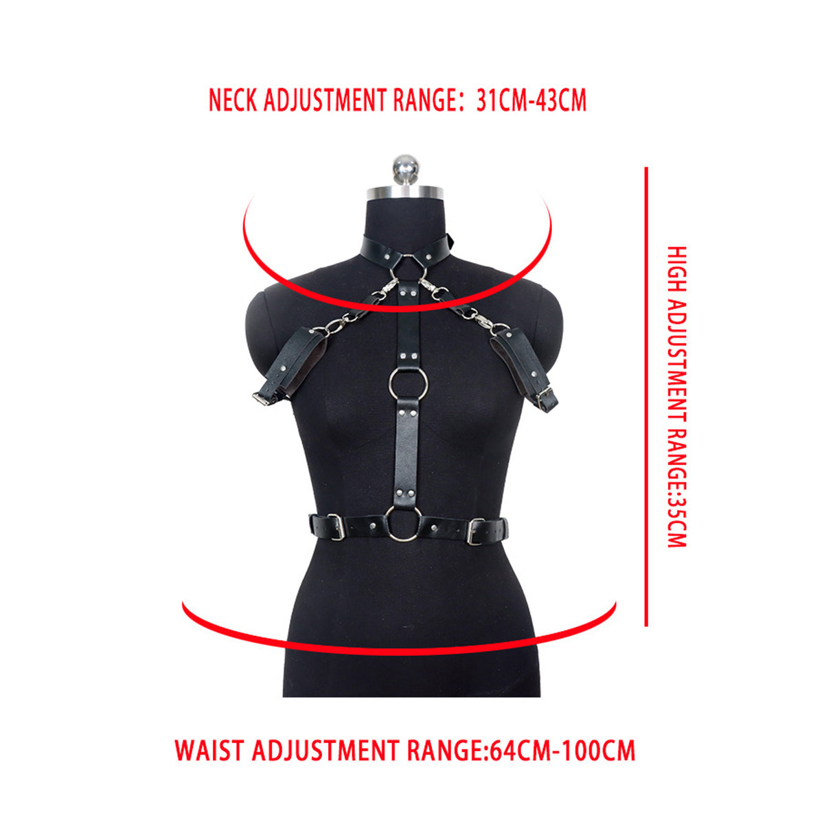 Design: Sexy leather harness top looks and feels like the real deal. It's the perfect accessory for a sleek and sexy look, featuring studded accents, O-ring accents, attached leg garters, detachable clip wrist cuffs, and an adjustable back belt closure for a perfect fit every time.
