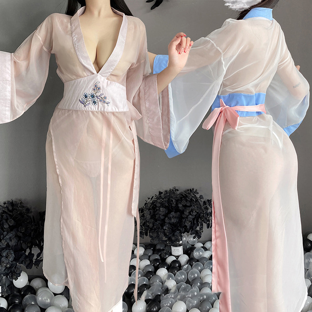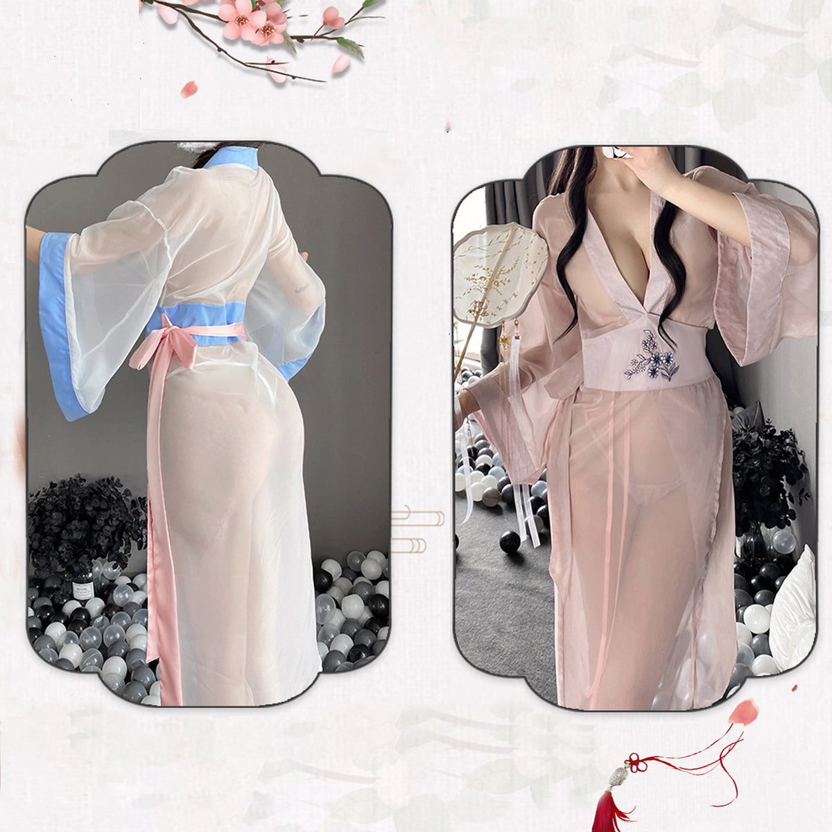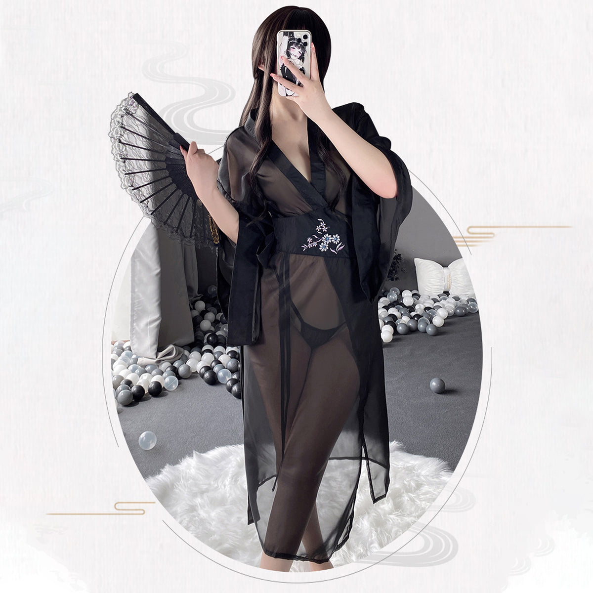 Yomorio Sheer Mesh Kimono Robe V Neck Long Yukata Anime Lingerie Set