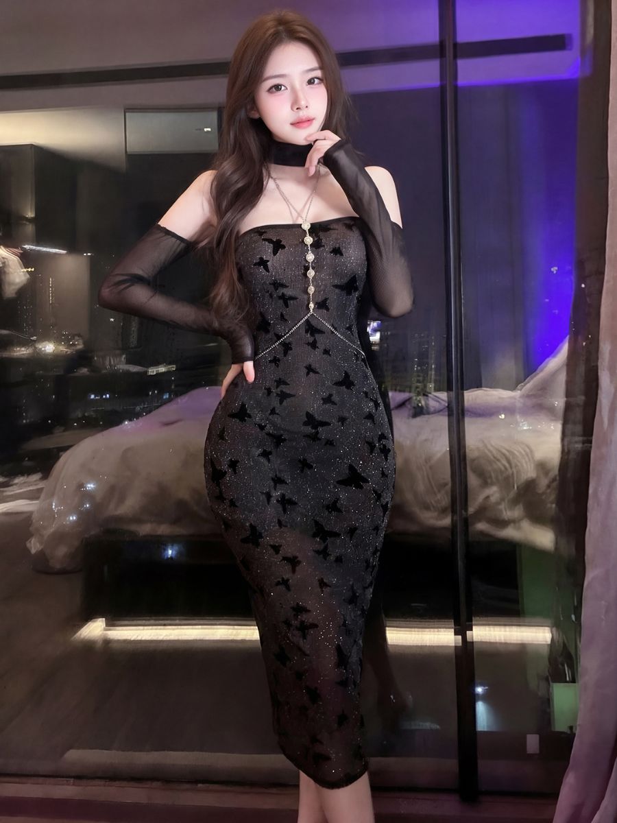 Design: This Butterfly Print Sheer Mesh Babydoll Dress featuring a off-the-shoulder neckline, a unique back cut-out slit and long mesh sleeves that add an elegant touch to the provocative design, a matching glitter-finish choker, and a coordinating G-string for a complete, curated look.