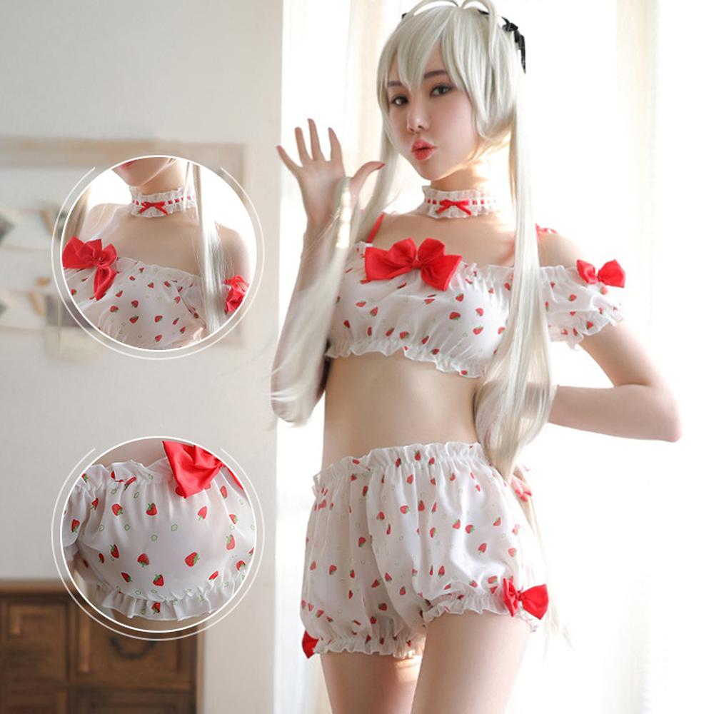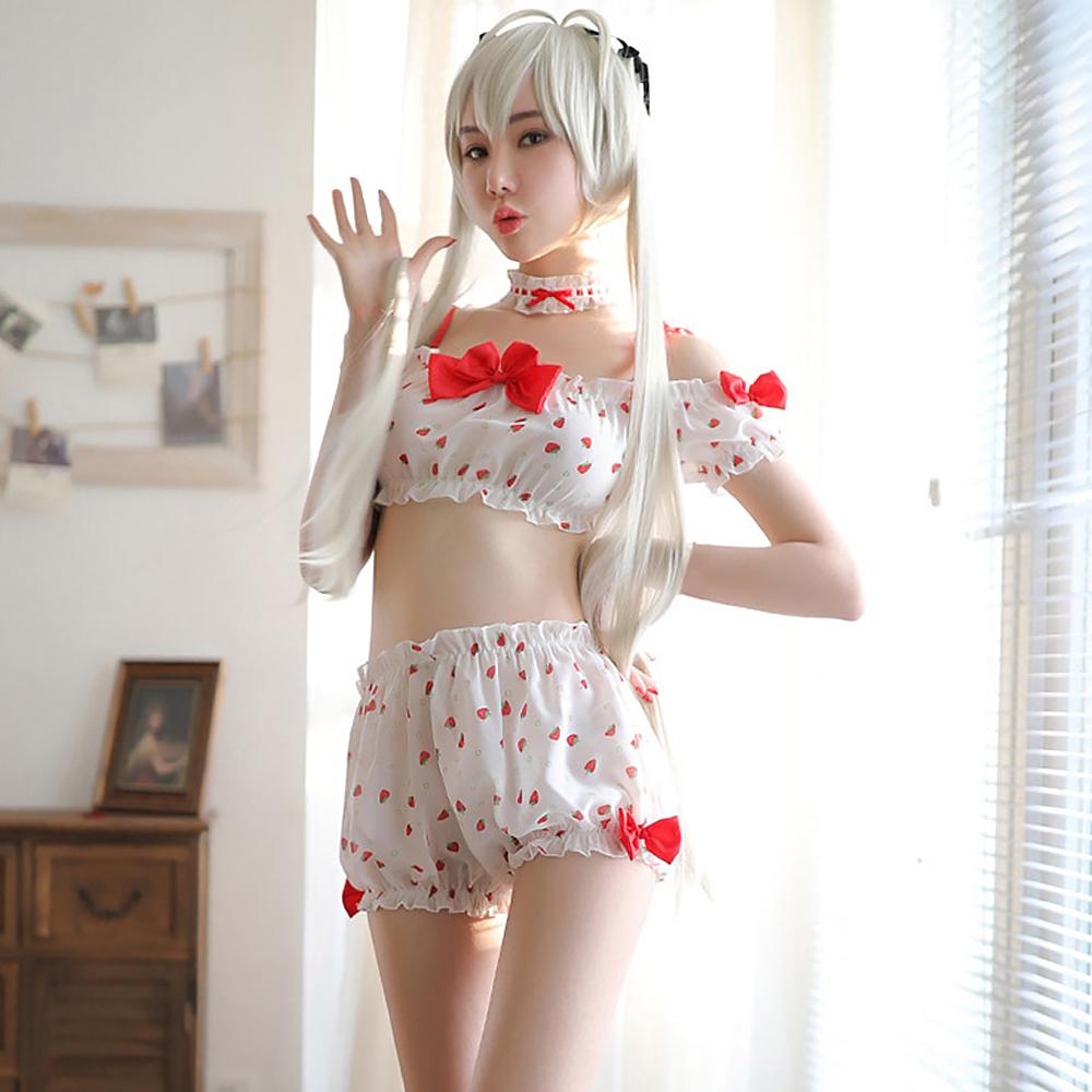Cute Lolita Cosplay Lingerie Strawberry Print Off Shoulder Crop Top and Pumpkin Shorts