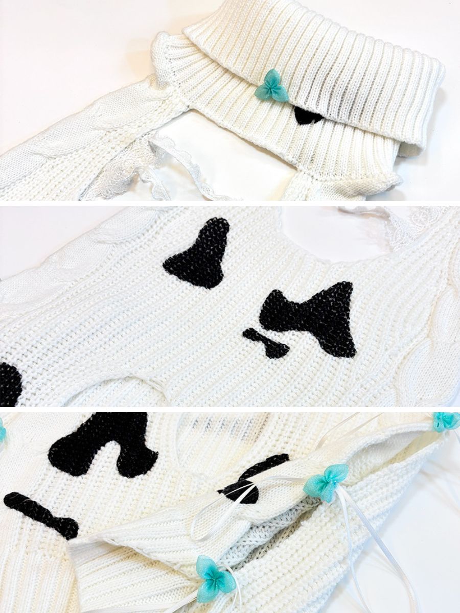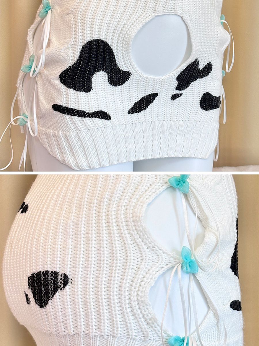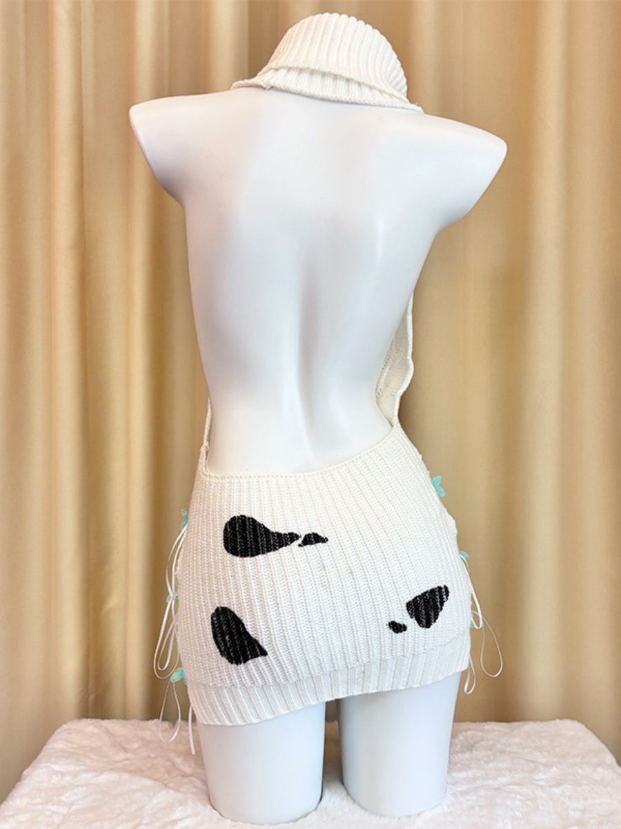 Design: Yomorio Sexy Milk Cow Cosplay Costume features a ribbed knit mini dress with cow print design, a high turtleneck, front a large keyhole, and slit hemline.