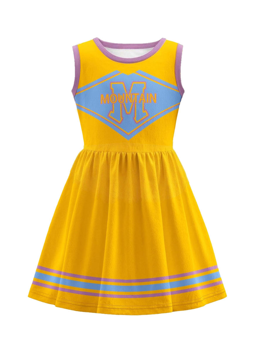 Design: American vampire musical film costume featuring a vibrant yellow cheerleader dress, a “MOUNTAIN” letter M print, and matching pompoms. restores the roles character.