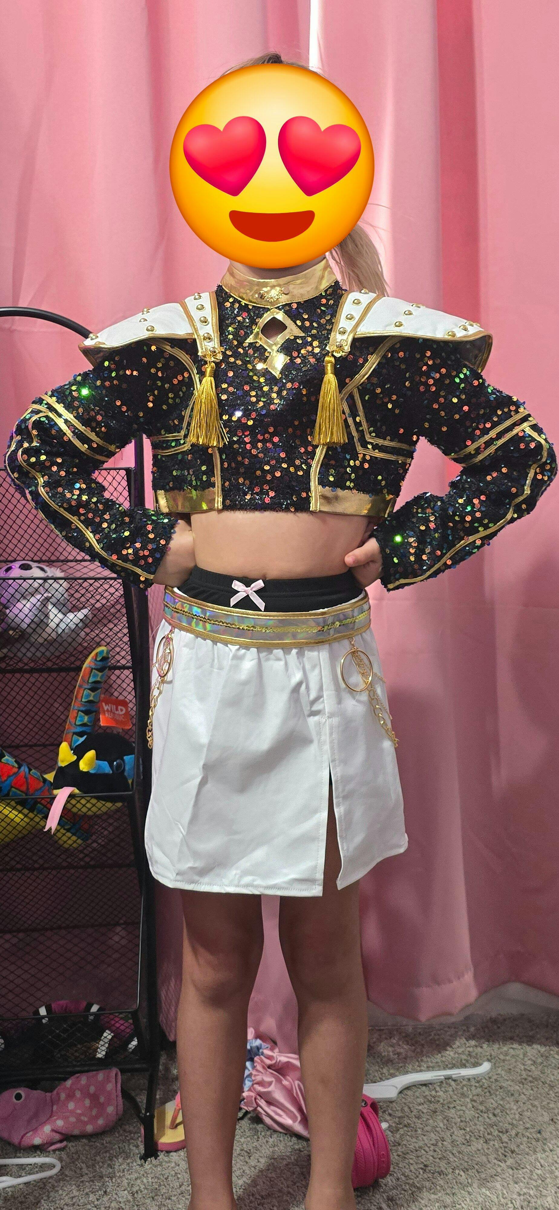 Design: Anime Super Idol Costume featuring a black sequin crop jacket adorned with white and gold epaulets, metallic trim, and golden tassels, creating a bold, and a matching white mini skirt comes detailed with layered metallic chains, oversized rings, and sequin waistband accents, restores the roles character.