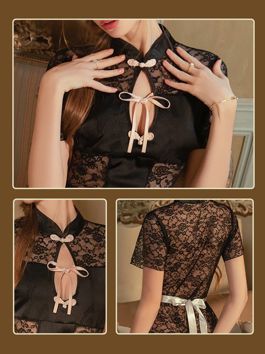 Design: Sexy Chinese-style lingerie dress featuring black lace mini dress, a high mandarin-style collar with a keyhole, sheer floral lace bodice, and a matching white apron with ruffled trim.