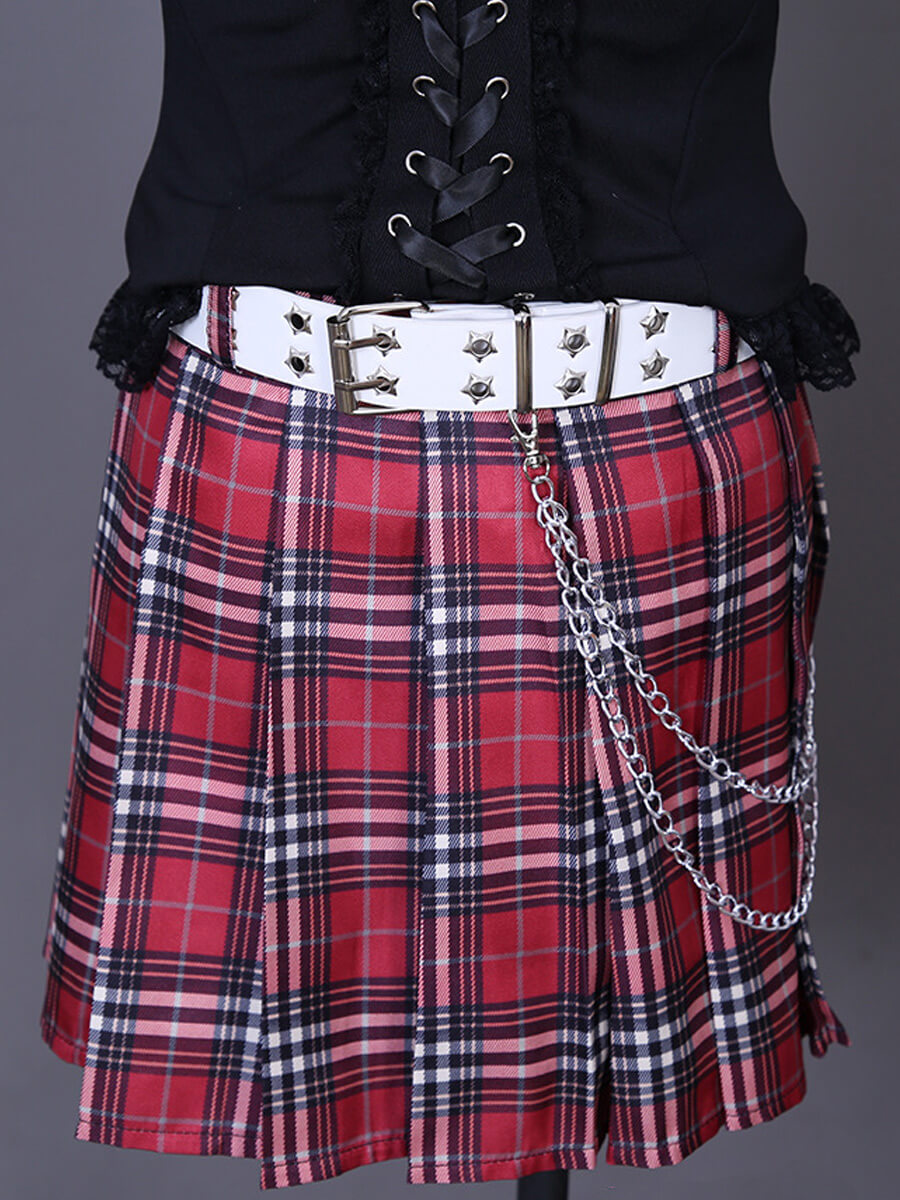 Design: Yomorio Misa Costume featuring white sleeveless shirt with red necktie, black underbust corset, front lace-up closure, and a pleated plaid mini skirt, will make you sexy, cute and attractive.