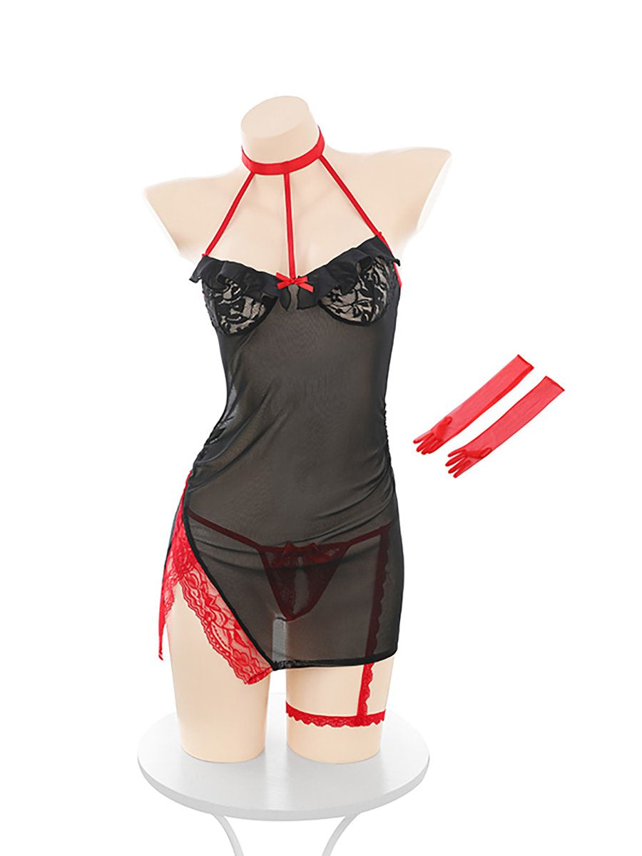 Design: Sexy Vintage Cheongsam Lingerie is designed with sheer mesh mini dress with lace cups, halter neckline, and a matching apron with ruffled trim. No restraints on chest with narrow bralette design, and the high slit dress are definitely fit on your body curves outline. It makes you more attractive, charming, fashion and chic.