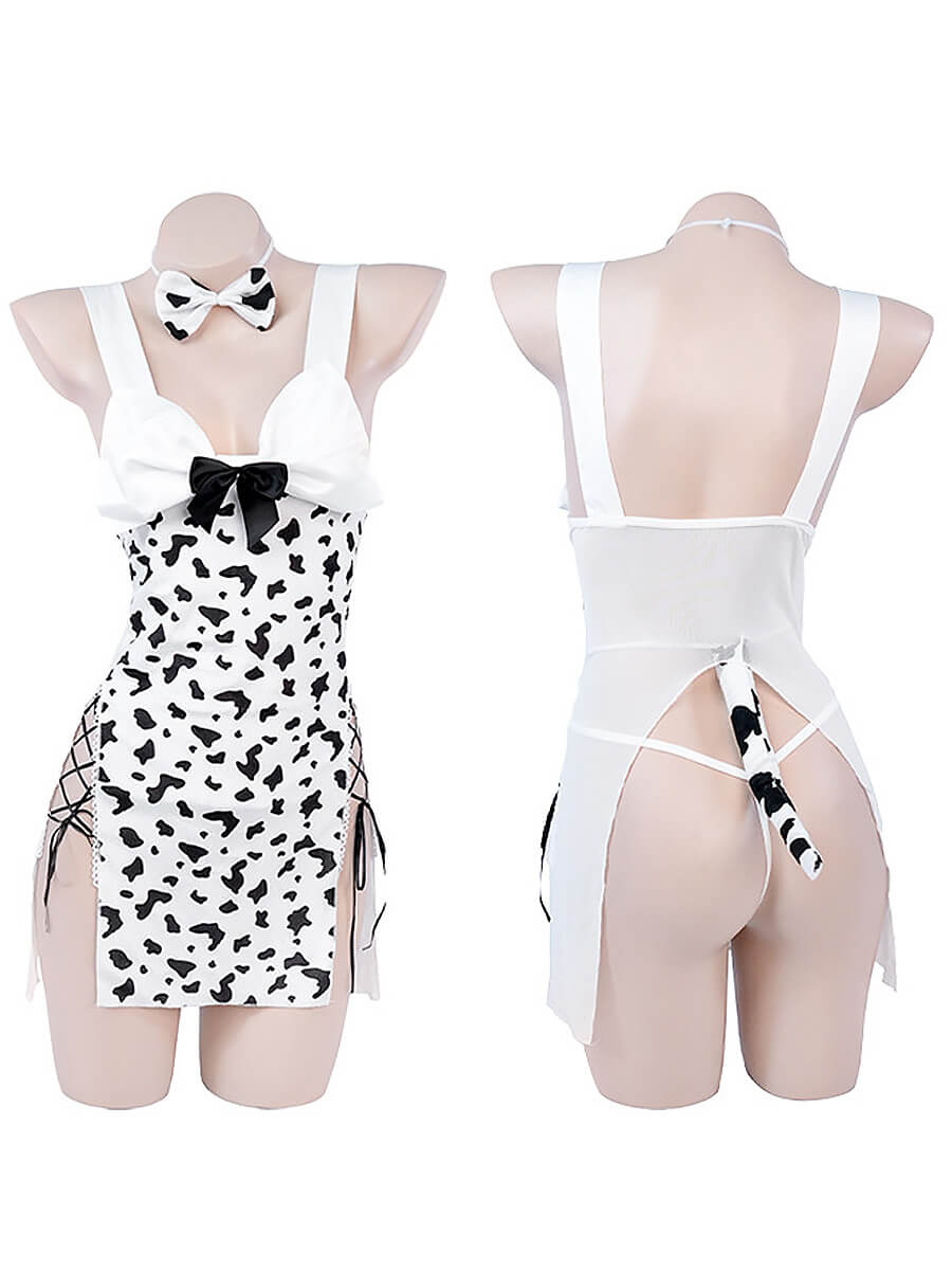 Design: Yomorio Milk Cow Cosplay Costume features a sexy mini dress, wide shoulder straps, Black and white spots pattern, front black bow accents, sides high slit and lace-up design, removable long tail, feel this cute animal role-playing suit brings different feeling.