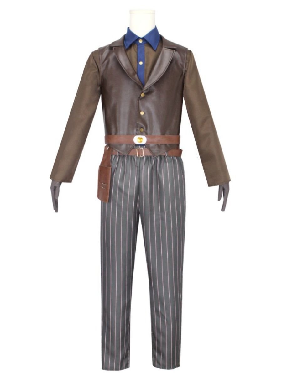 Design: Action Role-playing Game Cosplay Costume featuring a long, brown trench coat, a brown shirt, faux leather veat, and a matching classic suit pants with vintage pinstripe pattern, restores the game character.