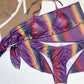 Design: 3 Piece thong bikini set featuring triangle padded cups, halter straps, a strappy underbust with a tie closure, an allover rainbow ombre design, and matching bottoms with a cheeky cut scrunch back. Cover-up skirt featuring an asymmetrical length, a tie closure, and a colorful pattern.