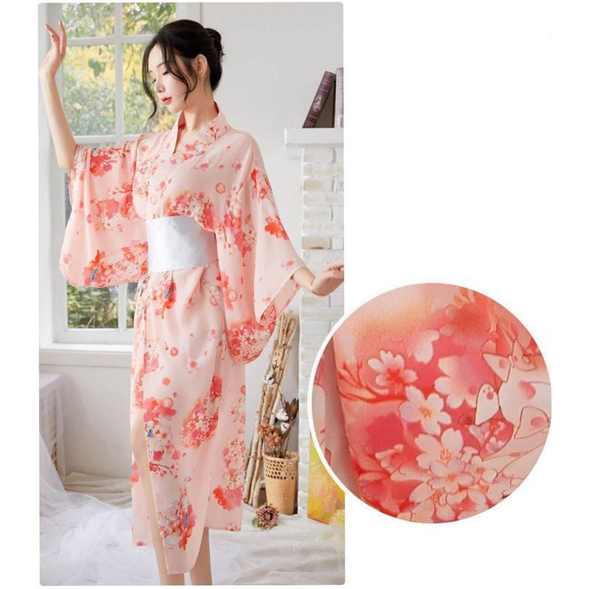 Design: Sexy kimonos cosplay outfit featuring chiffon kimono robe, wide long sleeves, show off your curves and figure while staying comfortable. Wrap around gorgeous Japanese kimono belt (obi) for a snatched waist. Kimono with wide sleeves and a cute bow at the back. This stylish print on this women's kimono pajamas adds interest to your life and makes you look younger and sexier.
